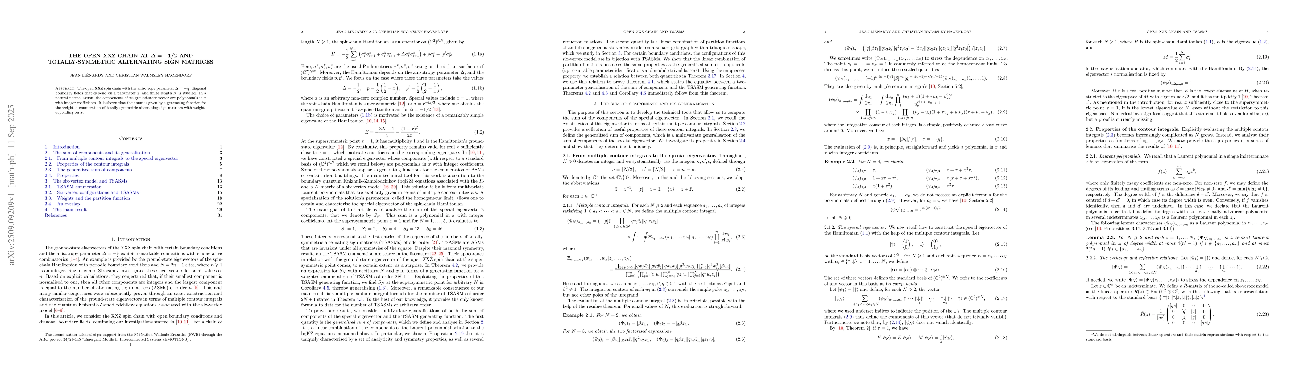 The open XXZ spin chain with the anisotropy parameter $\Delta=-\frac12$, diagonal boundary fields that depend on a parameter $x$, and finite length $N$ is studied. In a natural normalisation, the components of its ground-state vector are polynomials in $x$ with integer coefficients. It is shown that their sum is given by a generating function for the weighted enumeration of totally-symmetric alternating sign matrices with weights depending on $x$.