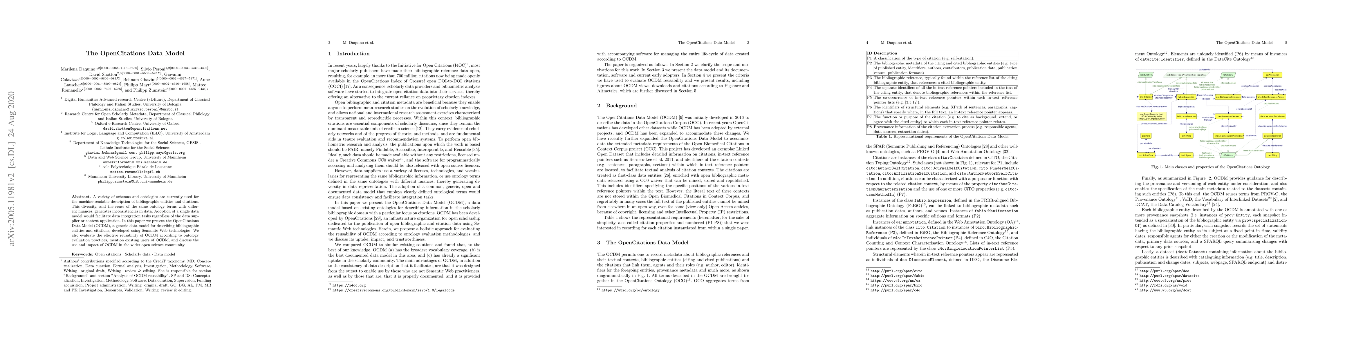 Researchers developed the OpenCitations Data Model to improve data integration of bibliographic entities and citations. It provides a generic data model using Semantic Web technologies to facilitate consistent data sharing across different contexts.
