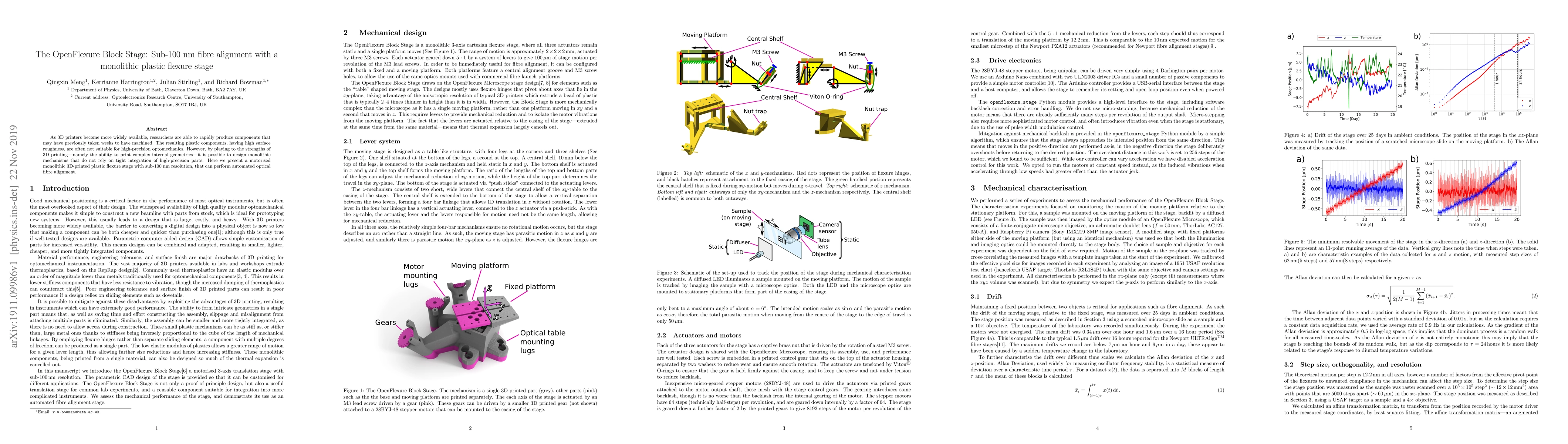 This paper introduces a motorized, monolithic 3D-printed plastic flexure stage capable of achieving sub-100 nm resolution for automated optical fibre alignment. It leverages the design flexibility of 3D printing to create precise mechanisms without relying on high-precision machining.