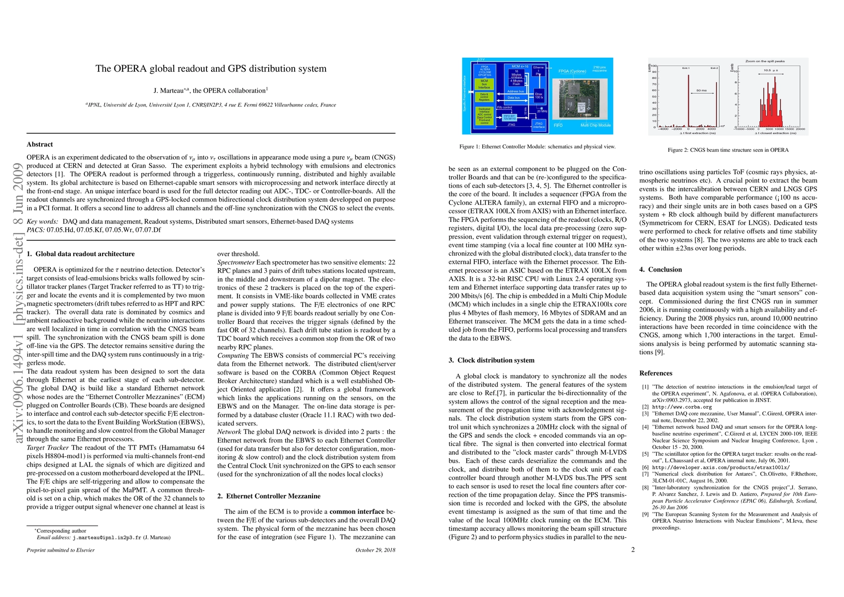 OPERA is an experiment dedicated to the observation of $\nu_\mu$ into $\nu_\tau$ oscillations in appearance mode using a pure $\nu_\mu$ beam (CNGS) produced at CERN and detected at Gran Sasso. The experiment exploits a hybrid technology with emulsions and electronics detectors \cite{opera}. The OPERA readout is performed through a triggerless, continuously running, distributed and highly available system. Its global architecture is based on Ethernet-capable smart sensors with microprocessing and network interface directly at the front-end stage. An unique interface board is used for the full detector reading out ADC-, TDC- or Controller-boards. All the readout channels are synchronized through a GPS-locked common bidirectional clock distribution system developped on purpose in a PCI format. It offers a second line to address all channels and the off-line synchronization with the CNGS to select the events.
