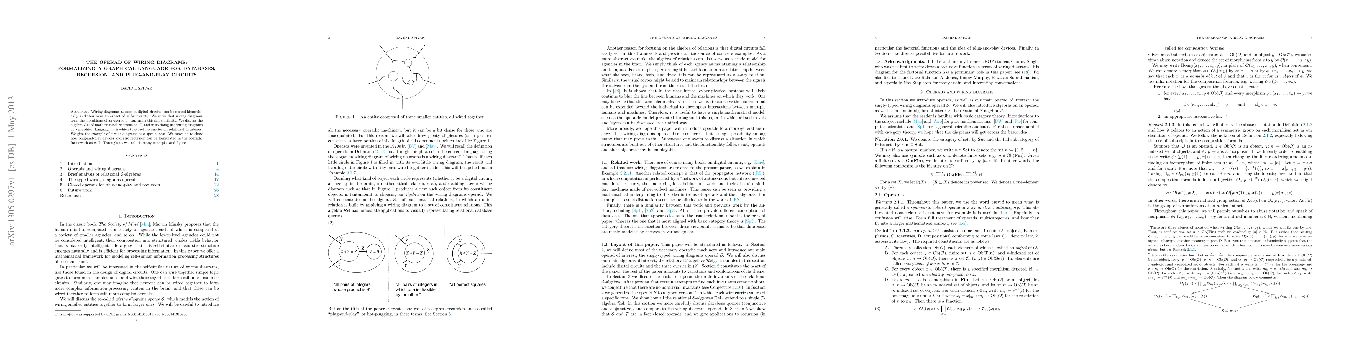 This paper formalizes a graphical language of wiring diagrams as the morphisms of an operad $\mcT$, illustrating their self-similarity. It uses wiring diagrams to structure queries on relational databases and extends the framework to cover plug-and-play circuits and recursion.