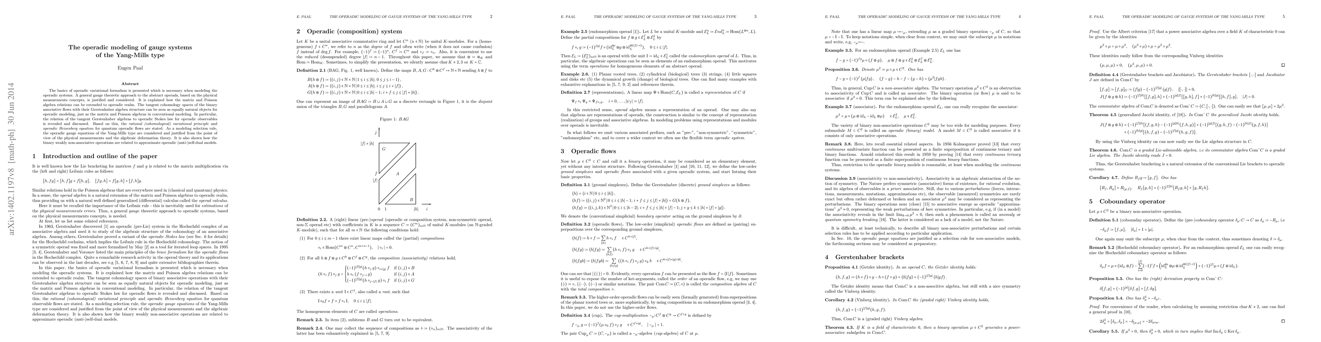 The basics of operadic variational formalism is presented which is necessary when modeling the operadic systems. A general gauge theoretic approach to the abstract operads, based on the physical measurements concepts, is justified and considered. It is explained how the matrix and Poisson algebra relations can be extended to operadic realm. The tangent cohomology spaces of the binary associative flows with their Gerstenhaber algebra structure can be seen as equally natural objects for operadic modeling, just as the matrix and Poisson algebras in conventional modeling. In particular, the relation of the tangent Gerstenhaber algebras to operadic Stokes law for operadic observables is revealed and discussed. Based on this, the rational (cohomological) variational principle and operadic Heisenberg equation for quantum operadic flows are stated. As a modeling selection rule, the operadic gauge equations of the Yang-Mills type are considered and justified from the point of view of the physical measurements and the algebraic deformation theory. It is also shown how the binary weakly non-associative operations are related to approximate operadic (anti-)self-dual models.