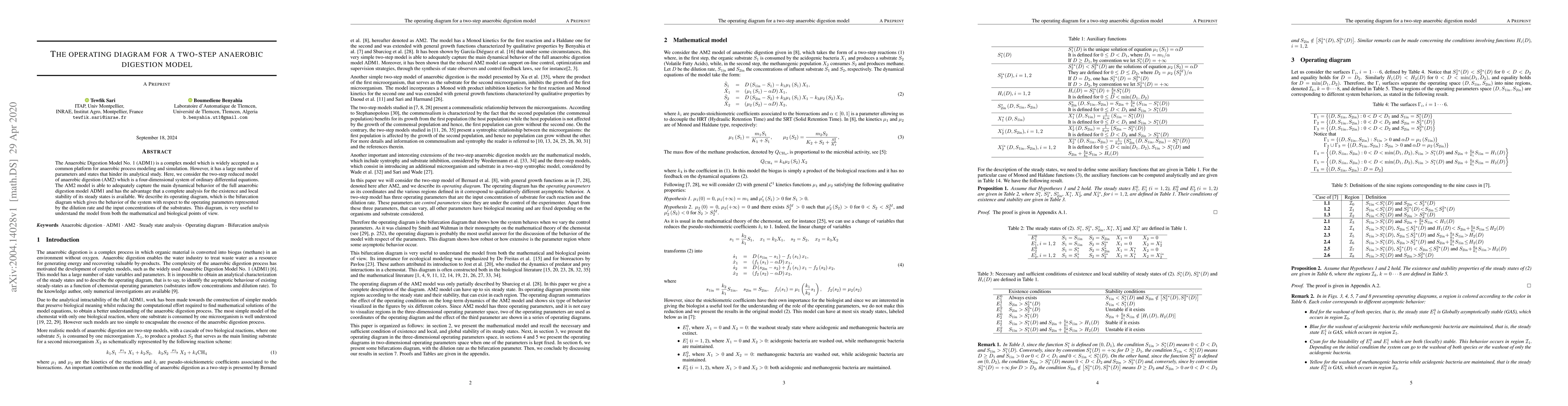 The research presents a two-step anaerobic digestion model (AM2), a four-dimensional system of ordinary differential equations, as a reduced model of the complex Anaerobic Digestion Model No. 1 (ADM1). The study analyzes the operating diagram of AM2, which is a bifurcation diagram representing the system's behavior concerning operating parameters: dilution rate (D) and input concentrations of substrates (S1in, S2in).