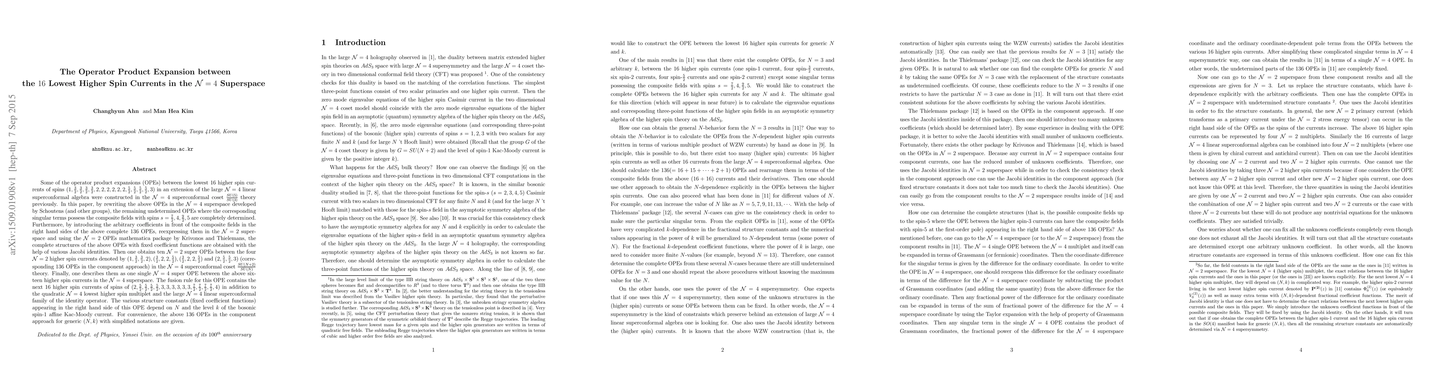 This paper determines the operator product expansions (OPEs) between the 16 lowest higher spin currents in the N=4 superspace, extending the large N=4 linear superconformal algebra. The remaining undetermined OPEs with composite fields of spins 7/2, 4, 9/2, and 5 are resolved using the N=4 superspace formalism and various Jacobi identities. The findings are presented as a single N=4 super OPE with fixed coefficient functions, describing the fusion rule for these higher spin currents.