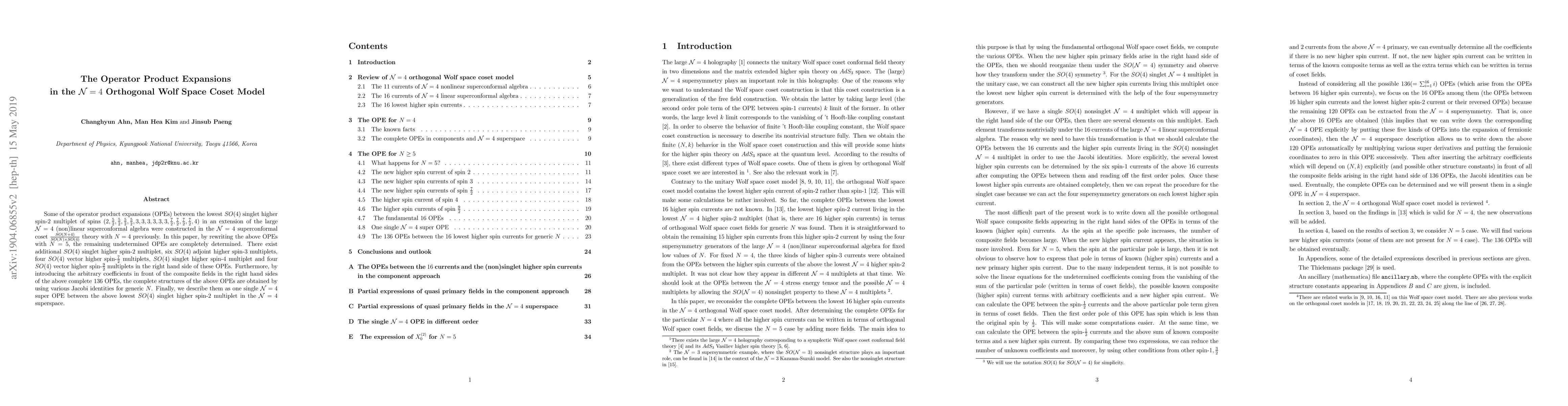 Some of the operator product expansions (OPEs) between the lowest $SO(4)$ singlet higher spin-$2$ multiplet of spins $(2, \frac{5}{2}, \frac{5}{2}, \frac{5}{2}, \frac{5}{2}, 3, 3, 3, 3, 3, 3, \frac{7}{2}, \frac{7}{2}, \frac{7}{2}, \frac{7}{2}, 4)$ in an extension of the large ${\cal N}=4$ (non)linear superconformal algebra were constructed in the ${\cal N}=4$ superconformal coset $\frac{SO(N+4)}{SO(N) \times SO(4)}$ theory with $N=4$ previously. In this paper, by rewriting the above OPEs with $N=5$, the remaining undetermined OPEs are completely determined. There exist additional $SO(4)$ singlet higher spin-$2$ multiplet, six $SO(4)$ adjoint higher spin-$3$ multiplets, four $SO(4)$ vector higher spin-$\frac{7}{2}$ multiplets, $SO(4)$ singlet higher spin-$4$ multiplet and four $SO(4)$ vector higher spin-$\frac{9}{2}$ multiplets in the right hand side of these OPEs. Furthermore, by introducing the arbitrary coefficients in front of the composite fields in the right hand sides of the above complete 136 OPEs, the complete structures of the above OPEs are obtained by using various Jacobi identities for generic $N$. Finally, we describe them as one single ${\cal N}=4$ super OPE between the above lowest $SO(4)$ singlet higher spin-$2$ multiplet in the ${\cal N}=4$ superspace.