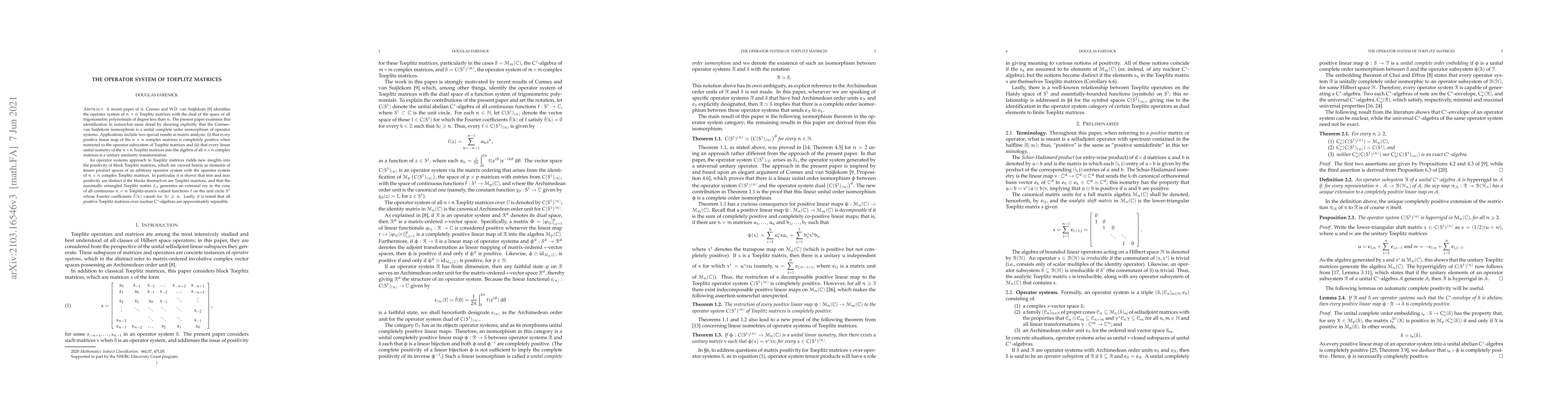 A recent paper of A.~Connes and W.D.~van Suijlekom identifies the operator system of $n\times n$ Toeplitz matrices with the dual of the space of all trigonometric polynomials of degree less than $n$. The present paper examines this identification in somewhat more detail by showing explicitly that the Connes--van Suijlekom isomorphism is a unital complete order isomorphism of operator systems. Consequences of this complete order isomorphism are also examined, yielding two special results of note: (i) that every positive linear map of the $n\times n$ complex matrices is completely positive when restricted to the operator subsystem of Toeplitz matrices and (ii) that every linear unital isometry of the $n\times n$ Toeplitz matrices into the algebra of all $n\times n$ complex matrices is a unitary similarity transformation. This latter result gives a new proof of a theorem established earlier. An operator systems approach to Toeplitz matrices yields new insights into the positivity of block Toeplitz matrices, which are viewed herein as elements of tensor product spaces of an arbitrary operator system with the operator system of $n\times n$ complex Toeplitz matrices. In particular, it is shown that min and max positivity are distinct if the blocks themselves are Toeplitz matrices, and that the maximally entangled Toeplitz matrix generates an extremal ray in the cone of all continuous $n\times n$ Toeplitz-matrix valued functions $f$ on the unit circle $S^1$ whose Fourier coffecients $\hat f(k)$ vanish for $|k|\geq n$ .