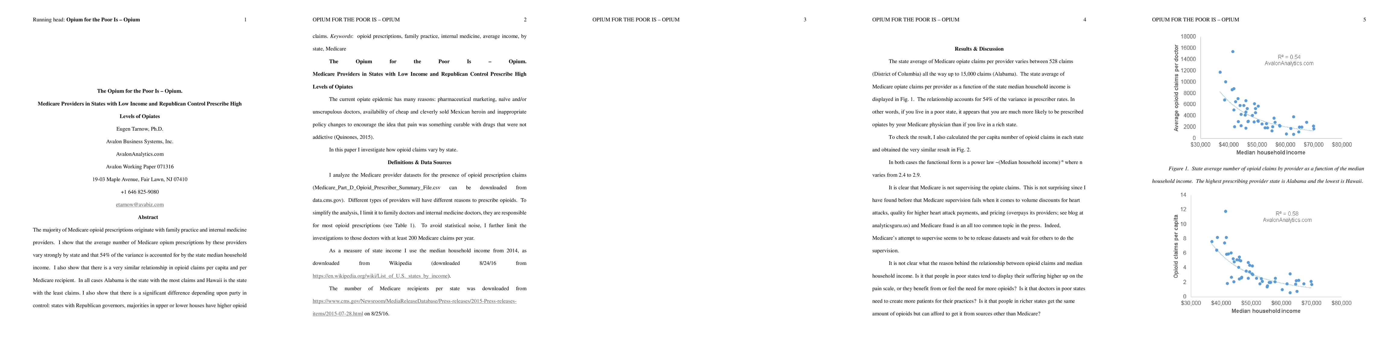 The majority of Medicare opioid prescriptions originate with family practice and internal medicine providers. I show that the average number of Medicare opium prescriptions by these providers vary strongly by state and that 54% of the variance is accounted for by the state median household income. I also show that there is a very similar relationship in opioid claims per capita and per Medicare recipient. In all cases Alabama is the state with the most claims and Hawaii is the state with the least claims.
