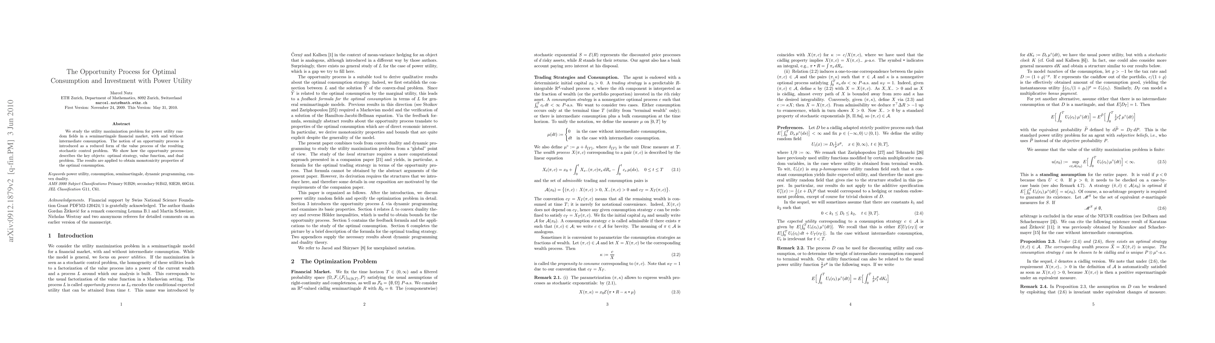 We study the utility maximization problem for power utility random fields in a semimartingale financial market, with and without intermediate consumption. The notion of an opportunity process is introduced as a reduced form of the value process of the resulting stochastic control problem. We show how the opportunity process describes the key objects: optimal strategy, value function, and dual problem. The results are applied to obtain monotonicity properties of the optimal consumption.