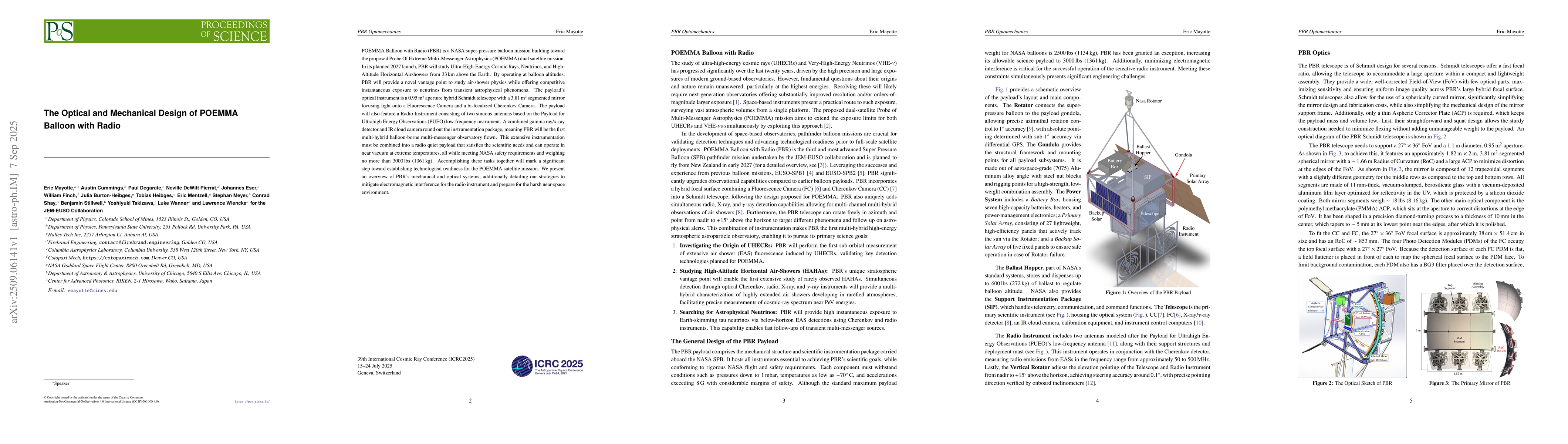 POEMMA Balloon with Radio (PBR) is a NASA super-pressure balloon mission building toward the proposed Probe Of Extreme Multi-Messenger Astrophysics (POEMMA) dual satellite mission. In its planned 2027 launch, PBR will study Ultra-High-Energy Cosmic Rays, Neutrinos, and High-Altitude Horizontal Airshowers from 33 km above the Earth. By operating at balloon altitudes, PBR will provide a novel vantage point to study air-shower physics while offering competitive instantaneous exposure to neutrinos from transient astrophysical phenomena. The payload's optical instrument is a 0.95 m$^2$ aperture hybrid Schmidt telescope with a 3.81 m$^2$ segmented mirror focusing light onto a Fluorescence Camera and a bi-focalized Cherenkov Camera. The payload will also feature a Radio Instrument consisting of two sinuous antennas based on the Payload for Ultrahigh Energy Observations (PUEO) low-frequency instrument. A combined gamma ray/x-ray detector and IR cloud camera round out the instrumentation package, meaning PBR will be the first multi-hybrid balloon-borne multi-messenger observatory flown. This extensive instrumentation must be combined into a radio quiet payload that satisfies the scientific needs and can operate in near vacuum at extreme temperatures, all while meeting NASA safety requirements and weighing no more than 3000 lbs (1361 kg). Accomplishing these tasks together will mark a significant step toward establishing technological readiness for the POEMMA satellite mission. We present an overview of PBR's mechanical and optical systems, additionally detailing our strategies to mitigate electromagnetic interference for the radio instrument and prepare for the harsh near-space environment.