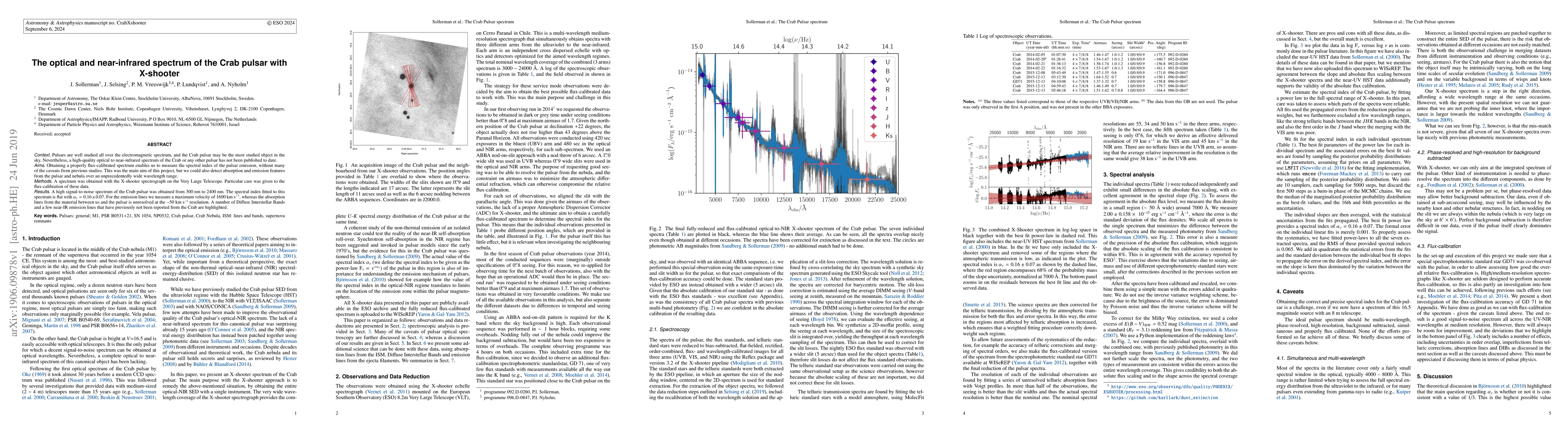 Pulsars are well studied all over the electromagnetic spectrum, and the Crab pulsar may be the most studied object in the sky. Nevertheless, a high-quality optical to near-infrared spectrum of the Crab or any other pulsar has not been published to date. Obtaining a properly flux-calibrated spectrum enables us to measure the spectral index of the pulsar emission, without many of the caveats from previous studies. This was the main aim of this project, but we could also detect absorption and emission features from the pulsar and nebula over an unprecedentedly wide wavelength range. A spectrum was obtained with the X-shooter spectrograph on the Very Large Telescope. Particular care was given to the flux-calibration of these data. A high signal-to-noise spectrum of the Crab pulsar was obtained from 300 to 2400nm. The spectral index fitted to this spectrum is flat with alpha_nu=0.16 +- 0.07. For the emission lines we measure a maximum velocity of 1600 km/s, whereas the absorption lines from the material between us and the pulsar is unresolved at the 50 km/s resolution. A number of Diffuse Interstellar Bands and a few near-IR emission lines that have previously not been reported from the Crab are highlighted.
