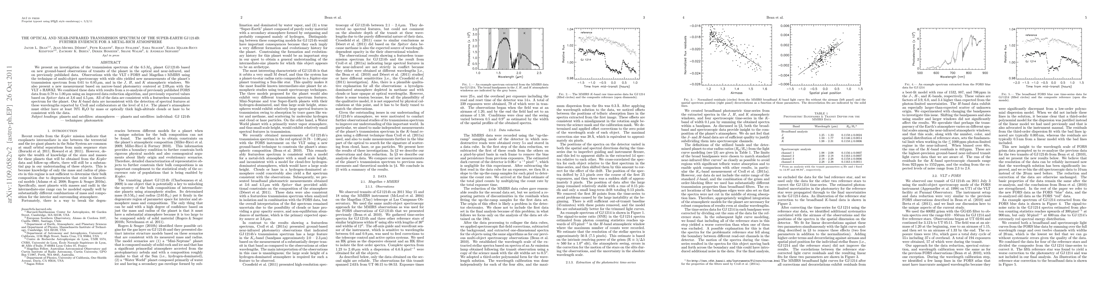 This study investigates the transmission spectrum of the super-Earth GJ1214b using new and previously published data, finding a featureless spectrum that suggests the atmosphere is either metal-rich or contains at least 70% water by mass. The results challenge previous claims of spectral features at certain wavelengths.