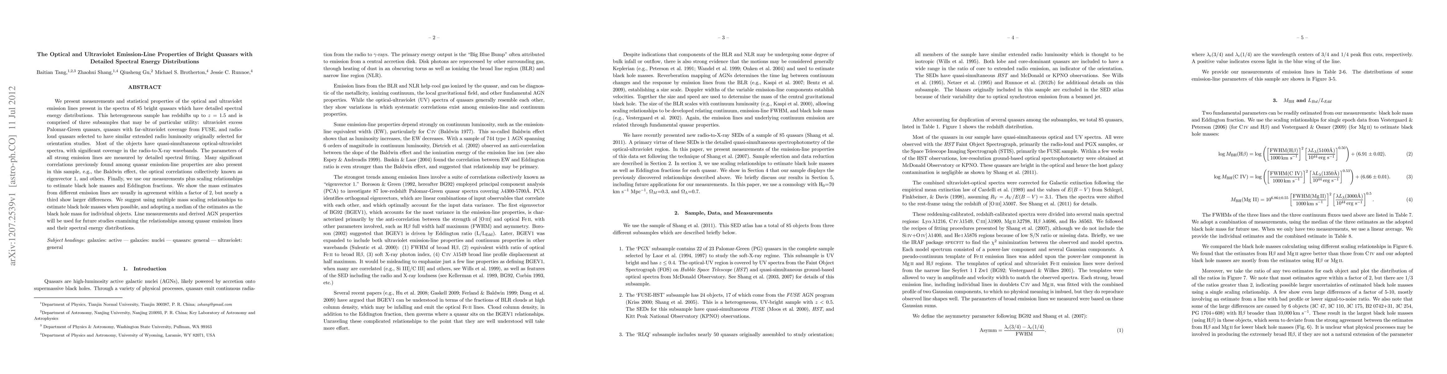 This study analyzes optical and ultraviolet emission lines in spectra of 85 bright quasars with detailed spectral energy distributions, revealing significant correlations among emission-line properties and suggesting the use of multiple scaling relationships for more accurate black hole mass estimates. The findings will inform future research on quasar emission lines and their spectral energy distributions.