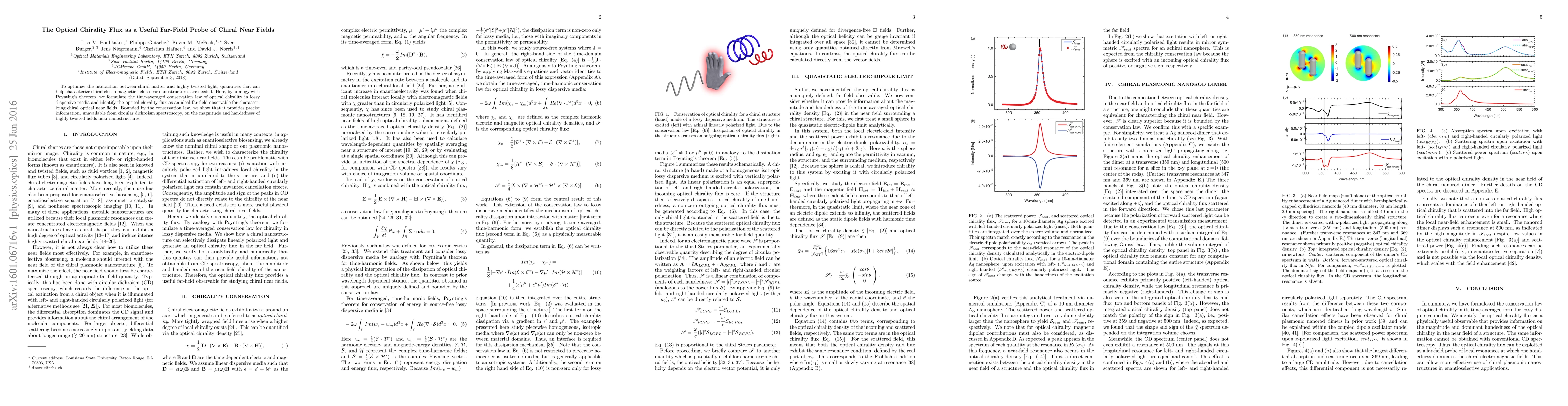 This paper formulates the conservation law of optical chirality in lossy dispersive media and identifies the optical chirality flux as a useful far-field probe for characterizing chiral near fields around nanostructures. It demonstrates that this flux provides detailed information on the magnitude and handedness of twisted fields, which cannot be obtained through circular dichroism spectroscopy.