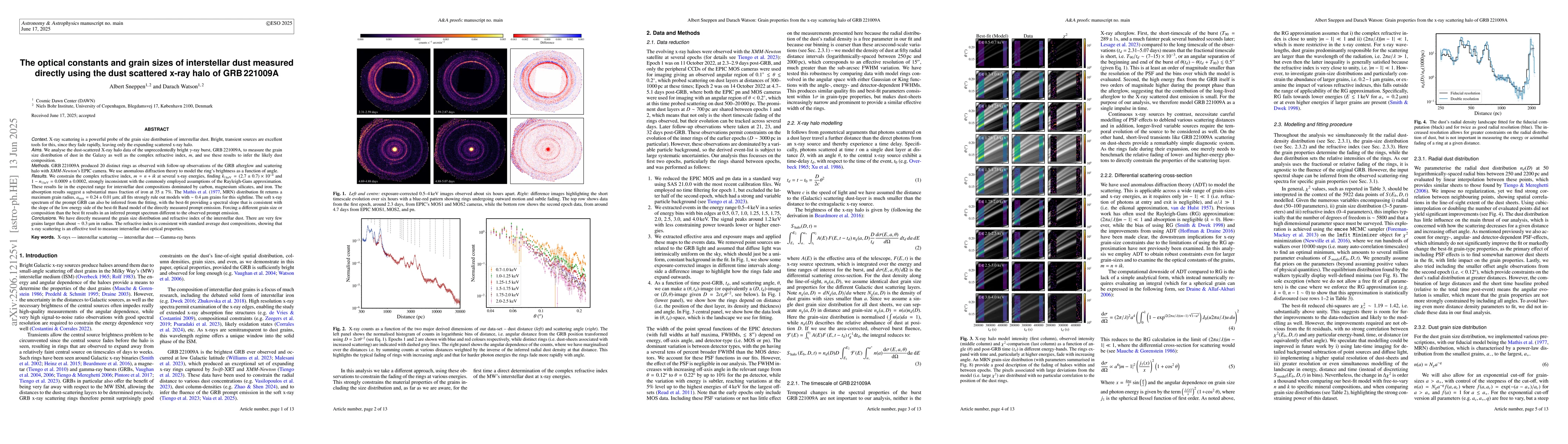 X-ray scattering is a powerful probe of the optical constants and grain size distribution of interstellar dust. Bright, transient sources are excellent tools for this, since they fade rapidly, leaving only the expanding scattered x-ray halo. Here, we analyse the dust-scattered x-ray halo data of the unprecedentedly bright $\gamma$-ray burst, GRB 221009A, using anomalous diffraction theory to measure the grain size distribution of dust in the Galaxy as well as the complex refractive index, $m$, and use these results to infer the likely composition. We find a complex refractive index, $m=n+ik$ at several x-ray energies, finding $k_{1\,\mathrm{keV}}= (2.7 \pm 0.7)\times10^{-4}$ and $1-n_{1\,\mathrm{keV}}= (9 \pm 2)\times 10^{-4}$, strongly inconsistent with the commonly employed assumptions of the Rayleigh-Gans approximation. These results lie in the expected range for interstellar dust compositions dominated by carbon, magnesium silicates, and iron. The absorption results suggest a substantial mass fraction of iron at $35\pm7\%$. The MRN distribution fit returns a maximum grain radius, $a_{\rm max}=0.24\pm 0.01\,\mu$m; all fits strongly rule out models with $\sim0.4\,\mu$m grains for this sightline. The soft x-ray spectrum of the prompt GRB can also be inferred from the fitting, with the best-fit providing a spectral slope that is consistent with the slope of the low energy side of the best-fit Band model of the directly measured prompt emission. Forcing a different grain size or composition than the best fit results in an inferred prompt spectrum different to the observed prompt emission. The refractive index is consistent with standard average dust compositions, showing that x-ray scattering is an effective tool to measure interstellar dust optical properties. [abridged]