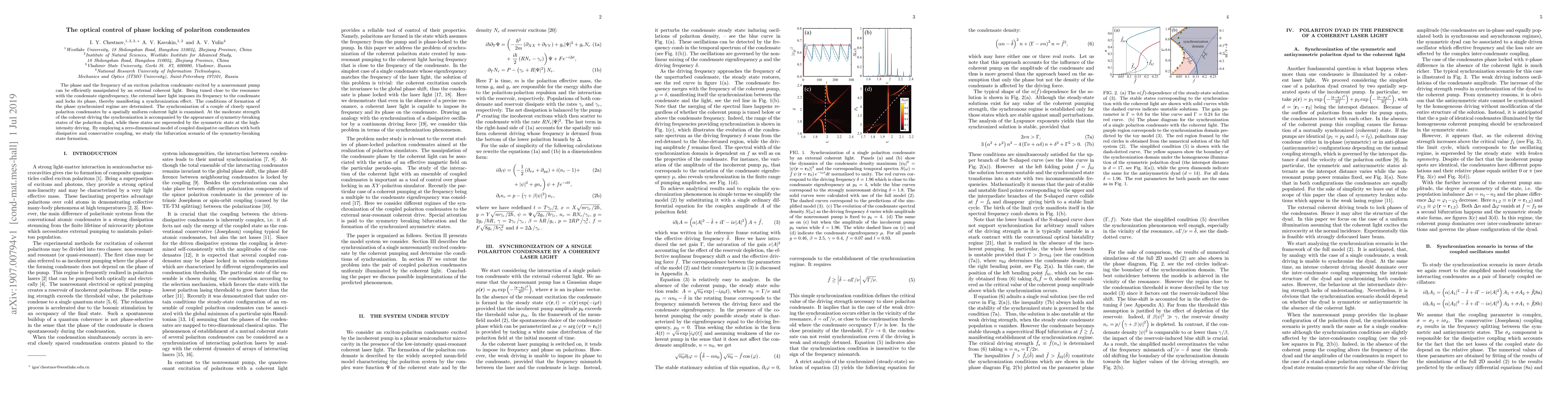 The research presents a novel approach to control polariton condensates using synchronization with coherent light, revealing a supercritical pitchfork bifurcation in the spontaneous symmetry-breaking scenario, which differs from previous studies focusing on resonant control methods.