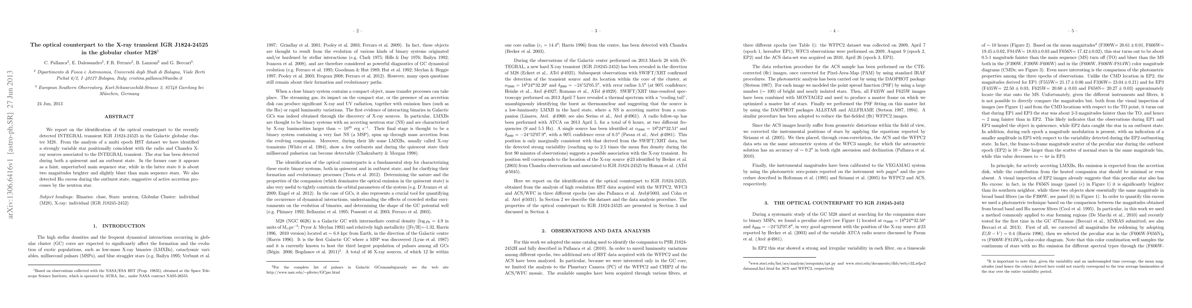 Researchers identified an optical counterpart to the X-ray transient IGR J18245-2452 in a Galactic globular cluster, detecting it during both quiescent and outburst states.