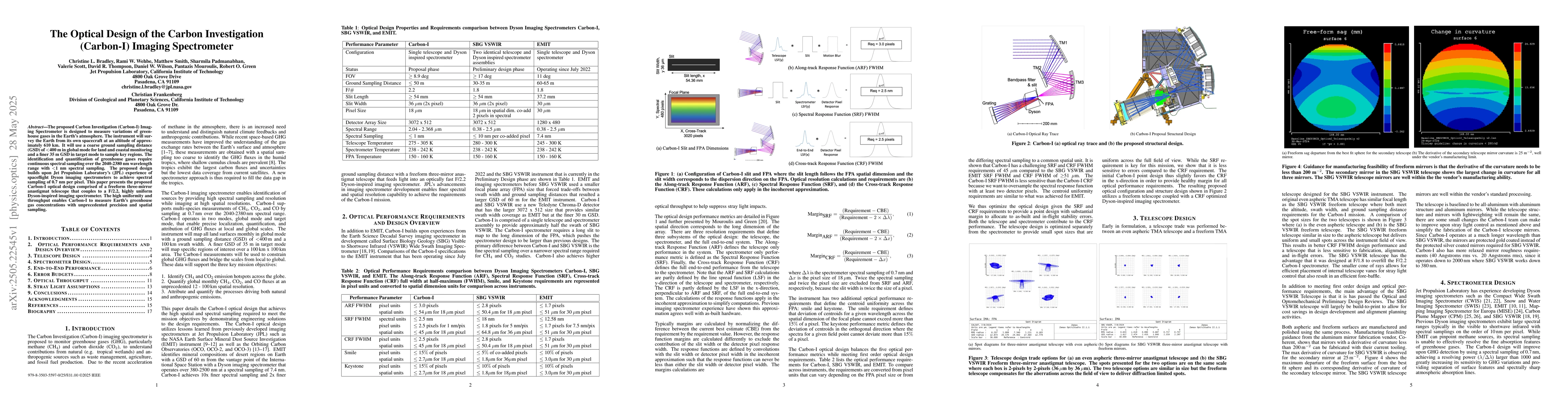 The paper outlines the optical design of the Carbon Investigation (Carbon-I) Imaging Spectrometer, detailing its freeform three-mirror anastigmat telescope and Dyson-inspired imaging spectrometer, both optimized for high uniformity and throughput.