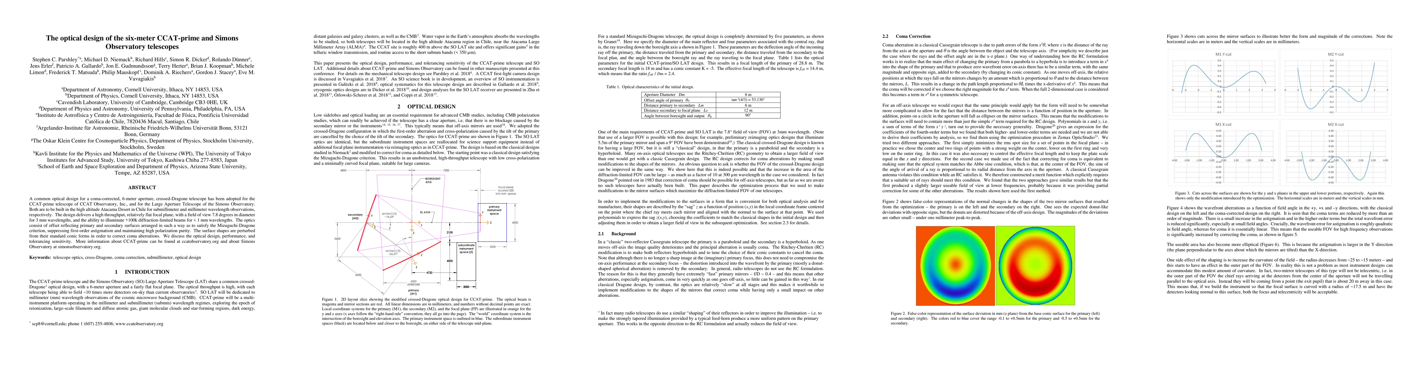The paper presents the optical design of the 6-meter CCAT-prime and Simons Observatory telescopes, utilizing a coma-corrected crossed-Dragone design for high-altitude submillimeter and millimeter observations in the Atacama Desert. The design achieves high throughput and a flat focal plane with a 7.8-degree field of view, while maintaining diffraction-limited beams and high polarization purity.