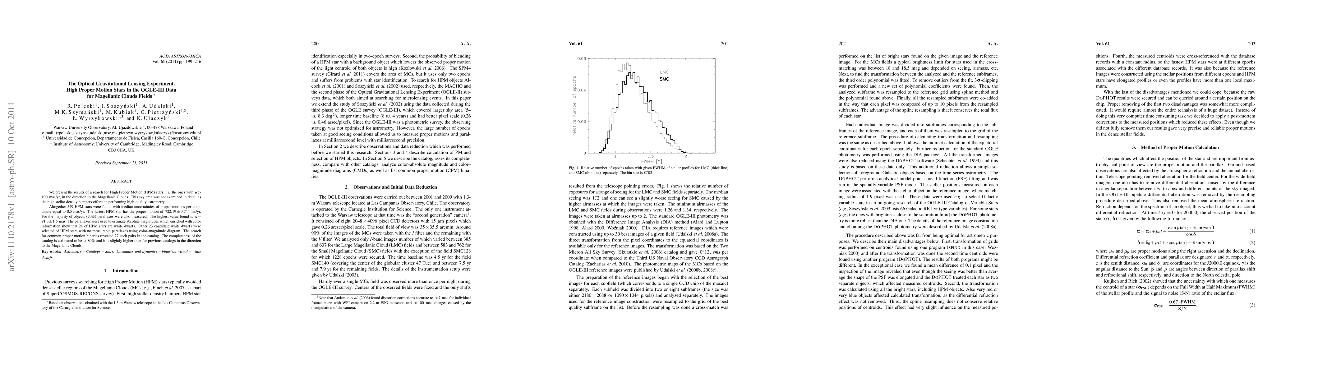 The study identifies 549 High Proper Motion stars in the Magellanic Clouds fields using OGLE-III data, with the fastest star moving at 722.19 mas/yr. The research also finds 21 confirmed white dwarfs and 27 common proper motion binary pairs, enhancing the catalog's completeness to over 80%.