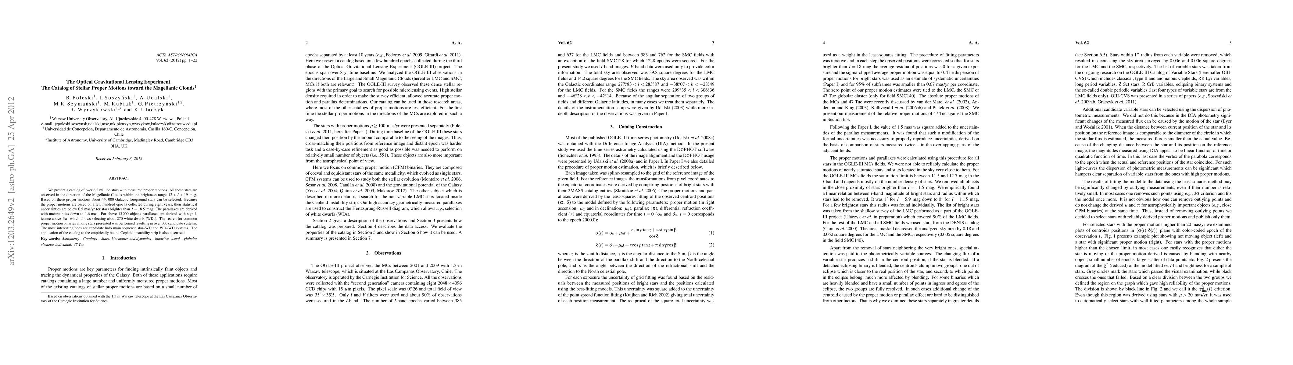 We present a catalog of over 6.2 million stars with measured proper motions. All these stars are observed in the direction of the Magellanic Clouds within the brightness range 12 < I < 19 mag. Based on these proper motions about 440 000 Galactic foreground stars can be selected. Because the proper motions are based on a few hundred epochs collected during eight years, their statistical uncertainties are below 0.5 mas/yr for stars brighter than I = 18.5 mag. The parallaxes are derived with uncertainties down to 1.6 mas. For above 13 000 objects parallaxes are derived with significance above 3\sigma, which allows selecting around 270 white dwarfs (WDs). The search for common proper motion binaries among stars presented was performed resulting in over 500 candidate systems. The most interesting ones are candidate halo main sequence star-WD and WD-WD systems. The application of the catalog to empirically bound the Cepheid instability strip is also discussed.