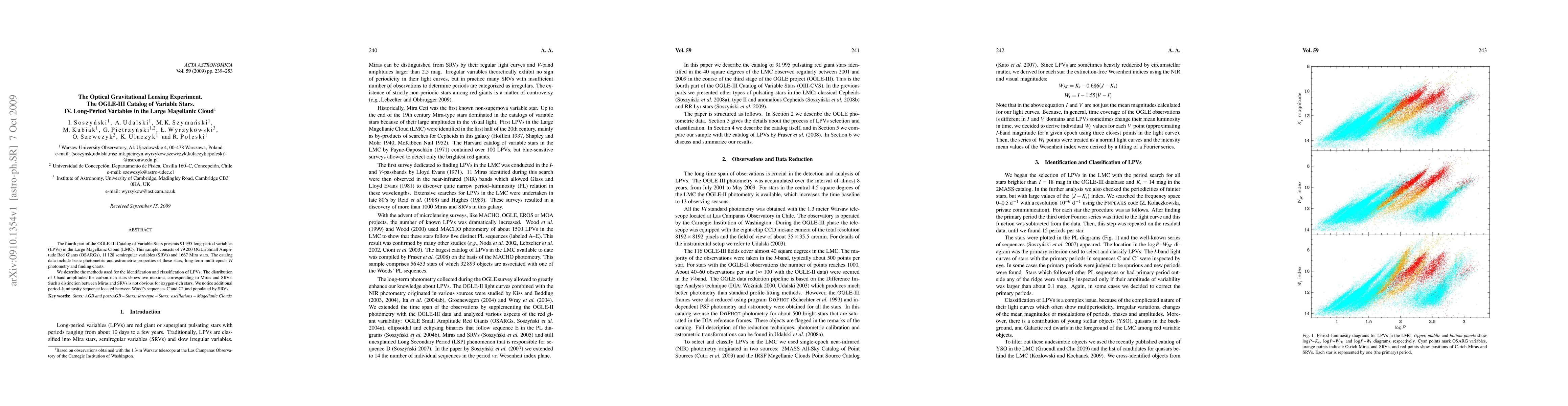 The OGLE-III Catalog of Variable Stars IV details 91,995 long-period variables in the Large Magellanic Cloud, including 79,200 Small Amplitude Red Giants, 11,128 semiregular variables, and 1,667 Mira stars, with comprehensive photometric and astrometric data. The study highlights distinct period-luminosity sequences for carbon-rich and oxygen-rich stars.