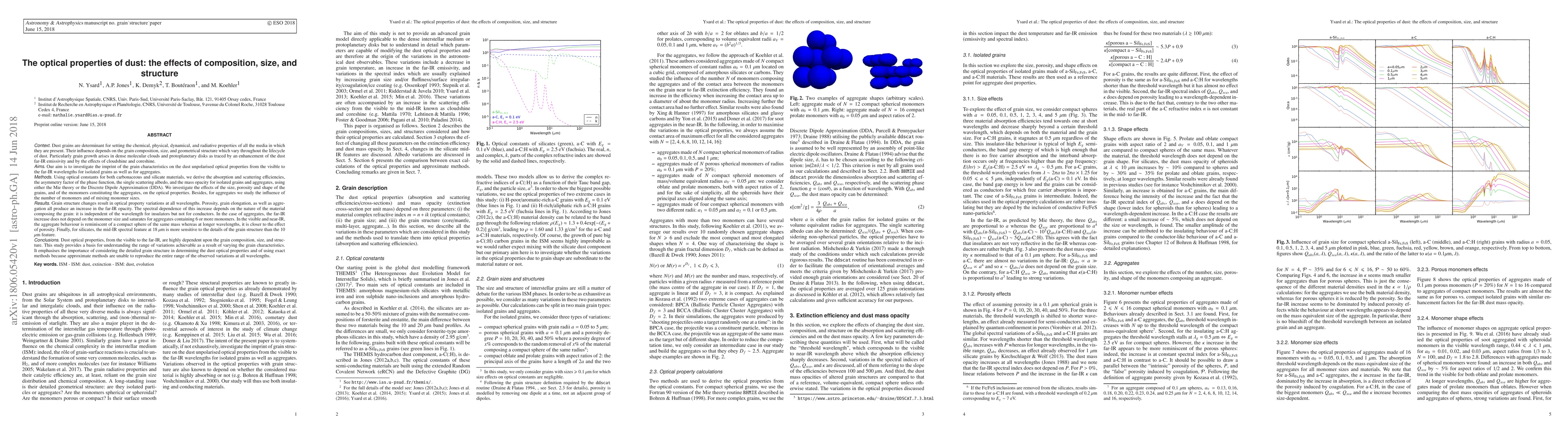 This paper investigates how the composition, size, and structure of dust grains affect their optical properties from visible to FIR wavelengths. It finds that variations in grain characteristics, including porosity and aggregation, significantly alter absorption, scattering, and opacity, with implications for understanding interstellar medium dynamics and radiative properties.