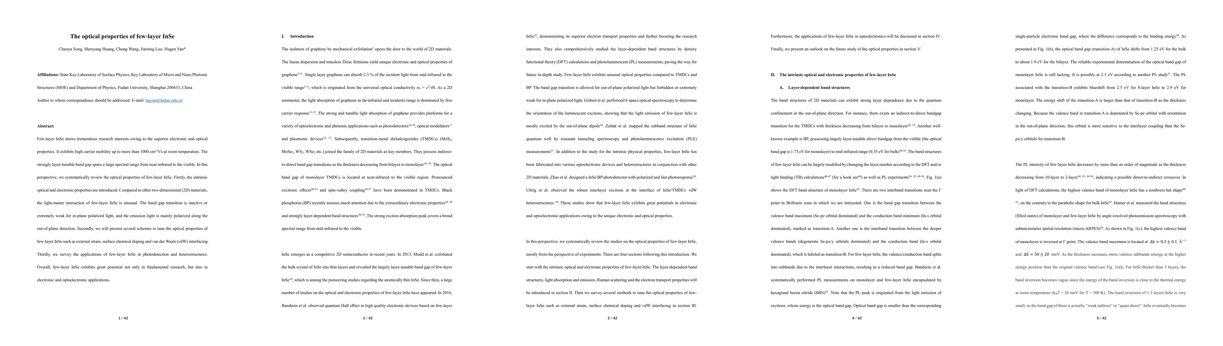 This paper reviews the optical properties of few-layer InSe, highlighting its unique light-matter interaction and tunable band gap, and discusses strategies for optical property tuning and its potential applications in photodetection and optoelectronic devices.