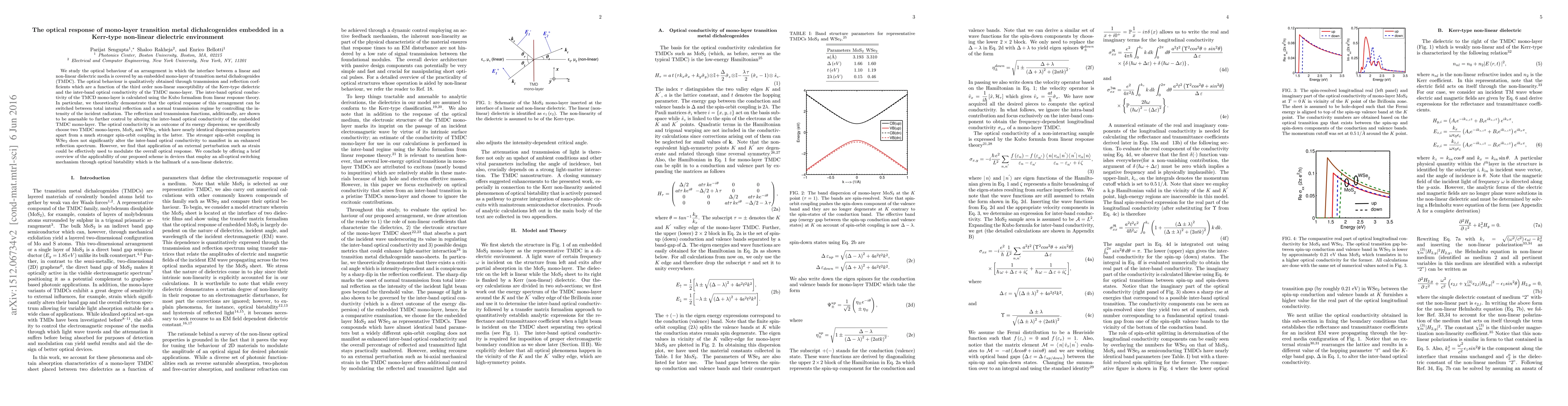 We study the optical behaviour of an arrangement in which the interface between a linear and non-linear dielectric media is covered by an embedded mono-layer of transition metal dichalcogenides (TMDC). The optical behaviour is qualitatively obtained through transmission and reflection coefficients which are a function of the third order non-linear susceptibility of the Kerr-type dielectric and the inter-band optical conductivity of the TMDC mono-layer. The inter-band optical conductivity of the TMCD mono-layer is calculated using the Kubo formalism from linear response theory. In particular, we theoretically demonstrate that the optical response of this arrangement can be switched between total internal reflection and a normal transmission regime by controlling the intensity of the incident radiation. The reflection and transmission functions, additionally, are shown to be amenable to further control by altering the inter-band optical conductivity of the embedded TMDC mono-layer. The optical conductivity is an outcome of its energy dispersion; we specifically choose two TMDC mono-layers, MoS$_{2}$ and WSe$_{2}$, which have nearly identical dispersion parameters apart from a much stronger spin-orbit coupling in the latter. The stronger spin-orbit coupling in WSe$_{2}$ does not significantly alter the inter-band optical conductivity to manifest in an enhanced reflection spectrum. However, we find that application of an external perturbation such as strain could be effectively used to modulate the overall optical response. We conclude by offering a brief overview of the applicability of our proposed scheme in devices that employ an all-optical switching mechanism through optical bistability which is the hallmark of a non-linear dielectric.