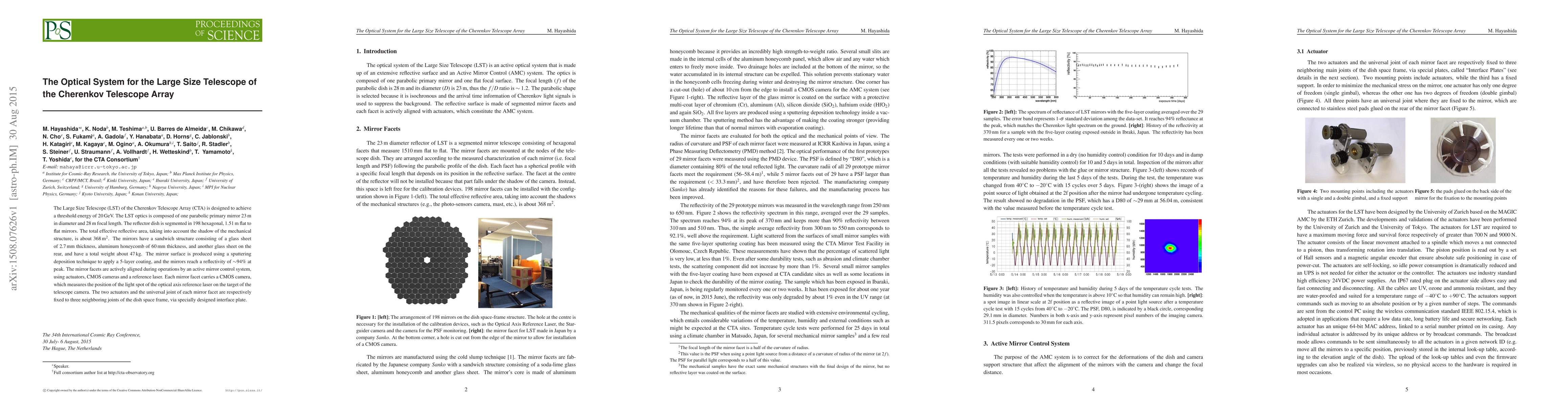 The Large Size Telescope of the Cherenkov Telescope Array achieves a threshold energy of 20 GeV with a parabolic primary mirror segmenting into 198 hexagonal mirrors, achieving a reflectivity of ~94%.
