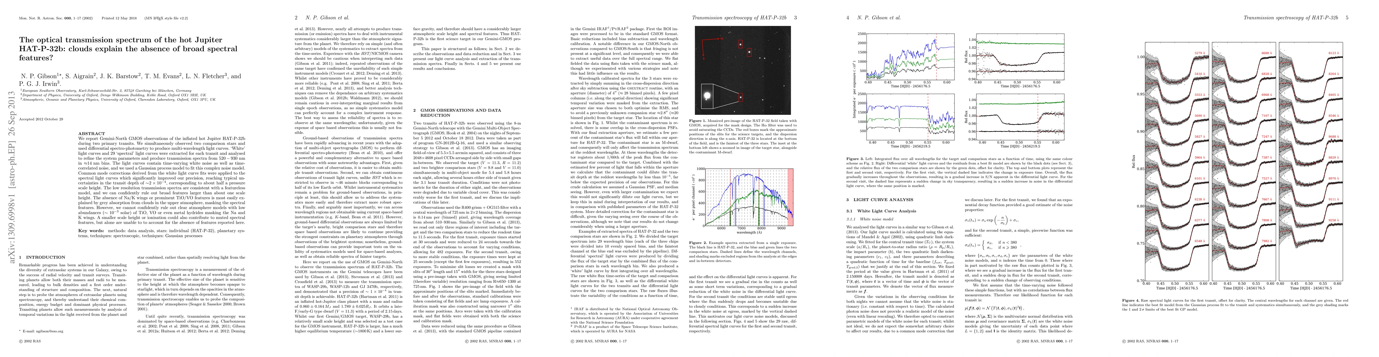 We report Gemini-North GMOS observations of the inflated hot Jupiter HAT-P-32b during two primary transits. We simultaneously observed two comparison stars and used differential spectro-photometry to produce multi-wavelength light curves. 'White' light curves and 29 'spectral' light curves were extracted for each transit and analysed to refine the system parameters and produce transmission spectra from 520-930nm in ~14nm bins. The light curves contain time-varying white noise as well as time-correlated noise, and we used a Gaussian process model to fit this complex noise model. Common mode corrections derived from the white light curve fits were applied to the spectral light curves which significantly improved our precision, reaching typical uncertainties in the transit depth of ~2x10^-4, corresponding to about half a pressure scale height. The low resolution transmission spectra are consistent with a featureless model, and we can confidently rule out broad features larger than about one scale height. The absence of Na/K wings or prominent TiO/VO features is most easily explained by grey absorption from clouds in the upper atmosphere, masking the spectral features. However, we cannot confidently rule out clear atmosphere models with low abundances (~10^-3 solar) of TiO, VO or even metal hydrides masking the Na and K wings. A smaller scale height or ionisation could also contribute to muted spectral features, but alone are unable to to account for the absence of features reported here.