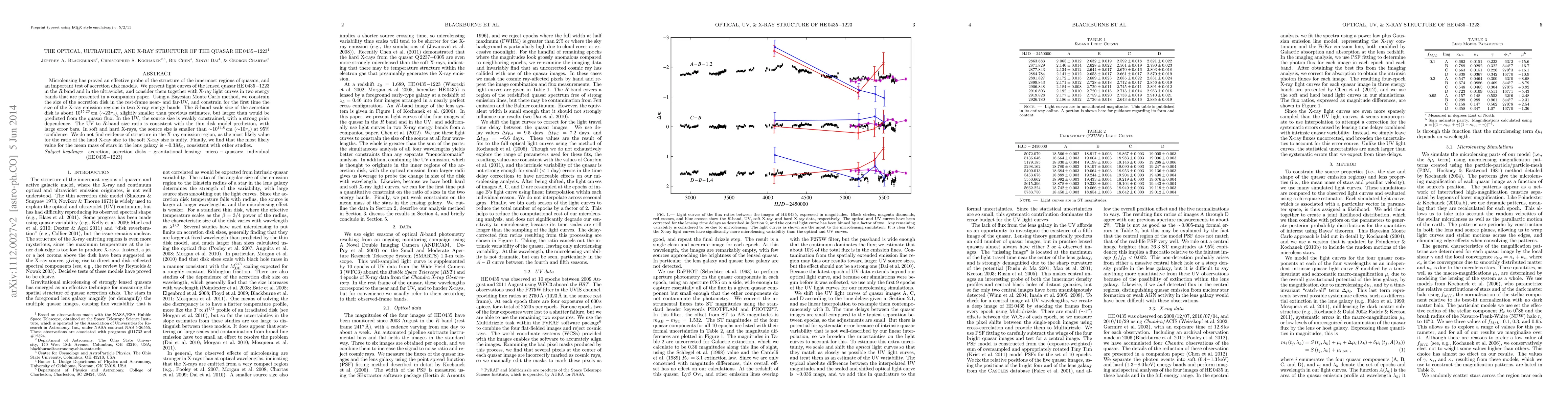 This paper uses microlensing to study the quasar HE 0435-1223, finding the accretion disk size in the R-band and UV, and constraining the X-ray emission regions. The R-band disk size is slightly smaller than previous estimates, while X-ray regions are smaller than ~10^14.8 cm.