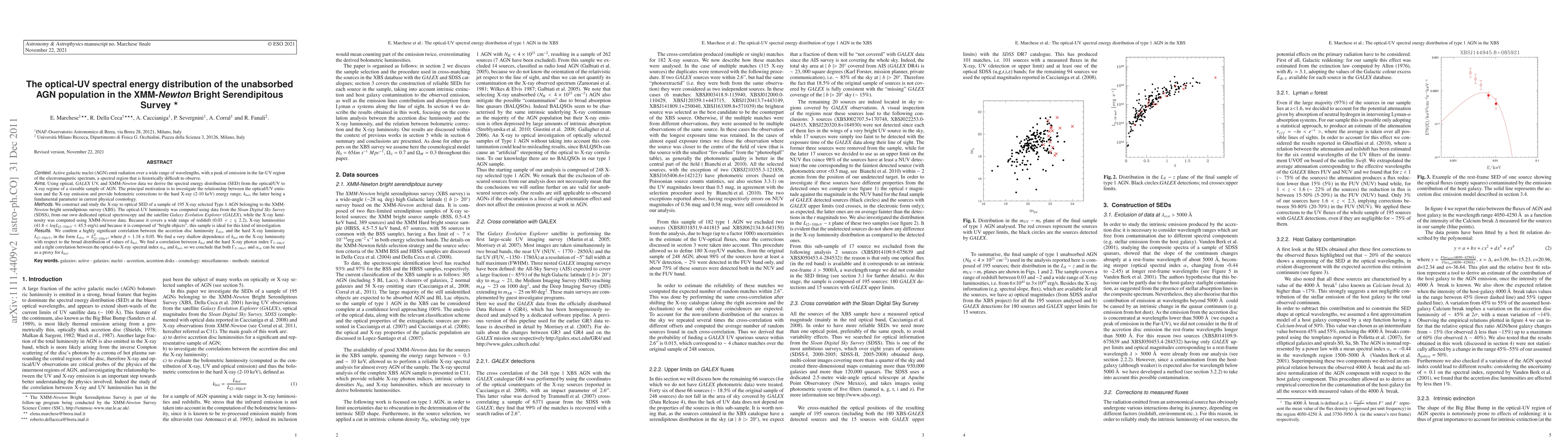Active galactic nuclei (AGN) emit radiation over a wide range of wavelengths, with a peak of emission in the far-UV region of the electromagnetic spectrum, a spectral region that is historically difficult to observe. Using optical, GALEX UV and XMM-Newton data we derive the spectral energy distribution (SED) from the optical/UV to X-ray regime of a sizeable sample of AGN. The principal motivation is to investigate the relationship between the optical/UV emission and the X-ray emission and provide bolometric corrections to the hard X-ray (2-10 keV) energy range, kbol, the latter being a fundamental parameter in current physical cosmology. We construct and study the X-ray to optical SED of a sample of 195 X-ray selected Type 1 AGN belonging to the XMM-Newton bright serendipitous survey (XBS). The optical-UV luminosity was computed using data from the Sloan Digital Sky Survey (SDSS), from our own dedicated optical spectroscopy and the satellite Galaxy Evolution Explorer (GALEX), while the X-ray luminosity was computed using XMM-Newton data. Because it covers a wide range of redshift (0.03 < z < 2.2), X-ray luminosities (41.8 < logL[2-10]keV < 45.5 erg/s) and because it is composed of "bright objects", this sample is ideal for this kind of investigation. We find a correlation between kbol and the hard X-ray photon index {\Gamma}(2-10keV) and a tight correlation between the optical-to-X-ray spectral index {\alpha}ox and kbol, so we conclude that both {\Gamma}(2-10keV) and {\alpha}ox can be used as a proxy for kbol.