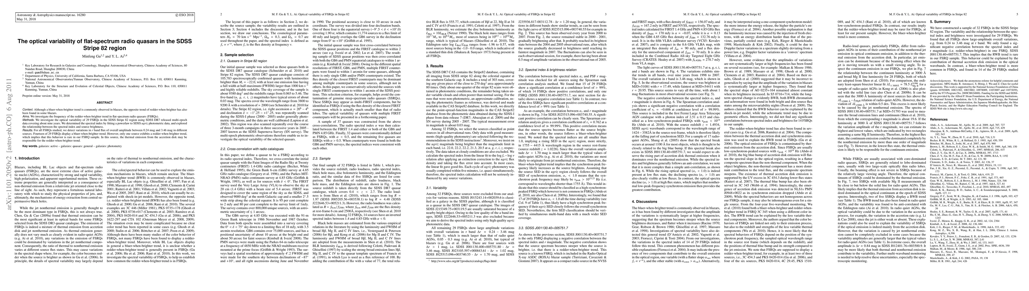 The study investigates the optical variability of 29 flat-spectrum radio quasars (FSRQs) in the SDSS Stripe 82 region using multi-epoch data from SDSS DR7, covering approximately nine years. The spectral index was determined by fitting a power-law to SDSS ugriz photometric data, and the relationship between the spectral index and source brightness was explored.