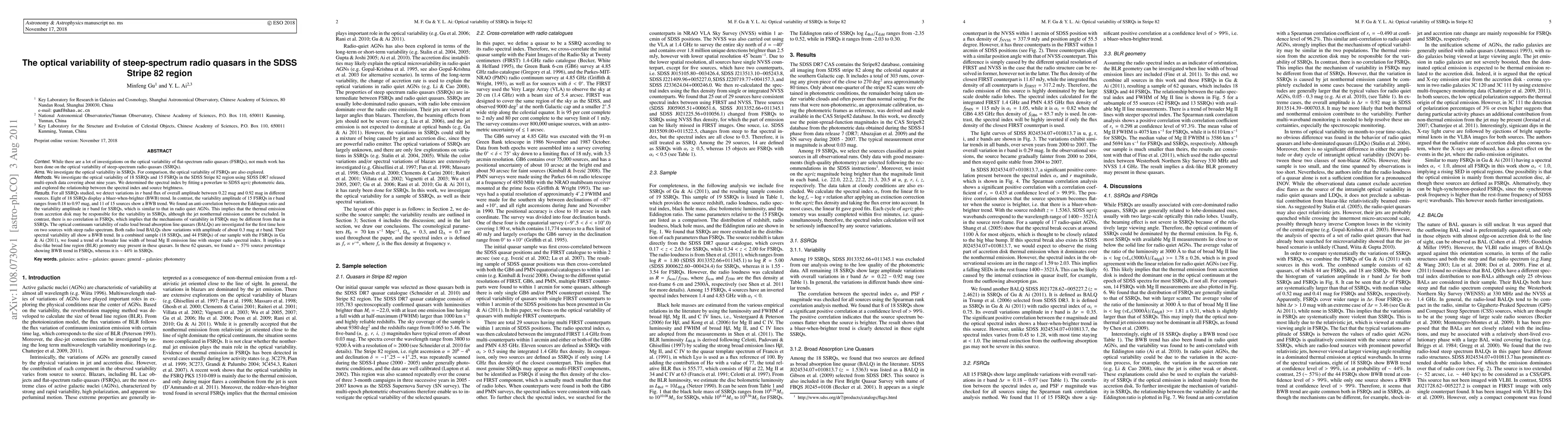 While there are a lot of investigations on the optical variability of flat-spectrum radio quasars (FSRQs), not much work has been done on the optical variability of steep-spectrum radio quasars (SSRQs). We investigate the optical variability of 18 SSRQs and 15 FSRQs in the SDSS Stripe 82 region using SDSS DR7 released multi-epoch data covering about nine years. For all SSRQs studied, we detect variations in r band flux of overall amplitude between 0.22 mag and 0.92 mag in different sources. Eight of 18 SSRQs display a bluer-when-brighter (BWB) trend. In contrast, the variability amplitude of 15 FSRQs in r band ranges from 0.18 to 0.97 mag, and 11 of 15 sources show a BWB trend. We found an anti-correlation between the Eddington ratio and the variability amplitude in r band for SSRQs, which is similar to that in radio quiet AGNs. This implies that the thermal emission from accretion disk may be responsible for the variability in SSRQs, although the jet nonthermal emission cannot be excluded. In contrast, there is no correlation in FSRQs, which implies that the mechanisms of variability in FSRQs may be different from that in SSRQs. The optical continuum variability of radio loud broad absorption line quasars (BALQs) are investigated for the first time here on two sources with steep radio spectrum. Both radio loud BALQs show variations with amplitude of about 0.3 mag at r band. Their spectral variability all show a BWB trend. In a combined sample (18 SSRQs, and 44 FSRQs) of our sample with the FSRQs in Gu & Ai (2011), we found a trend of a broader line width of broad Mg II emission line with steeper radio spectral index. It implies a disc-like broad line region (BLR) geometry may present in these quasars. In these 62 quasars, we found a ~ 57% source percentage showing BWB trend in FSRQs, whereas it is ~ 44% in SSRQs.