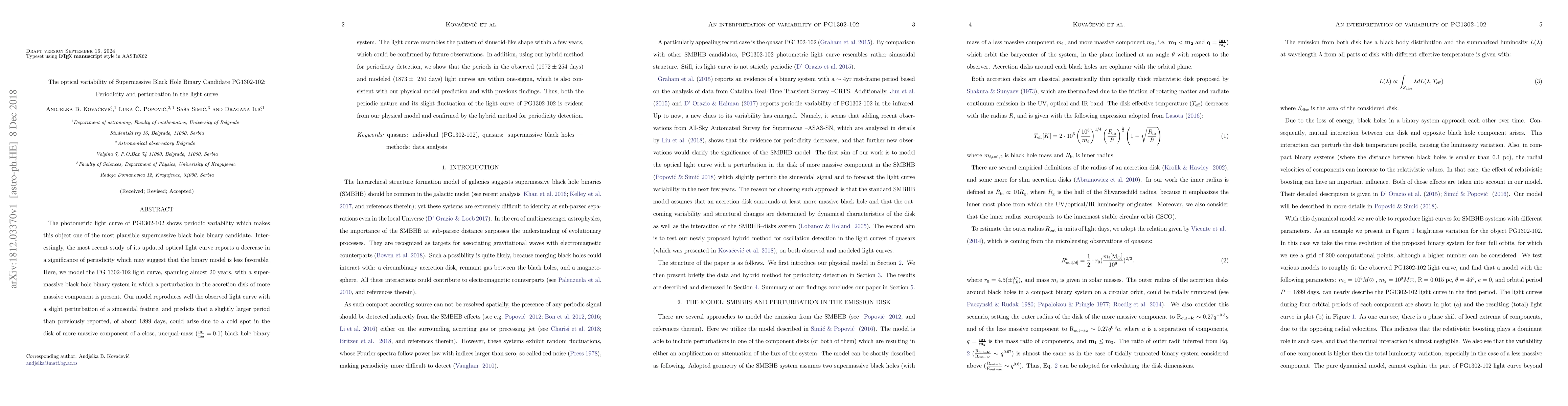 This paper investigates the optical variability of the supermassive black hole binary candidate PG1302-102, finding periodic variability in its light curve. The study models the observed light curve over nearly 20 years, suggesting a perturbation in the accretion disk of the more massive black hole, which predicts a slightly longer period of about 1899 days.
