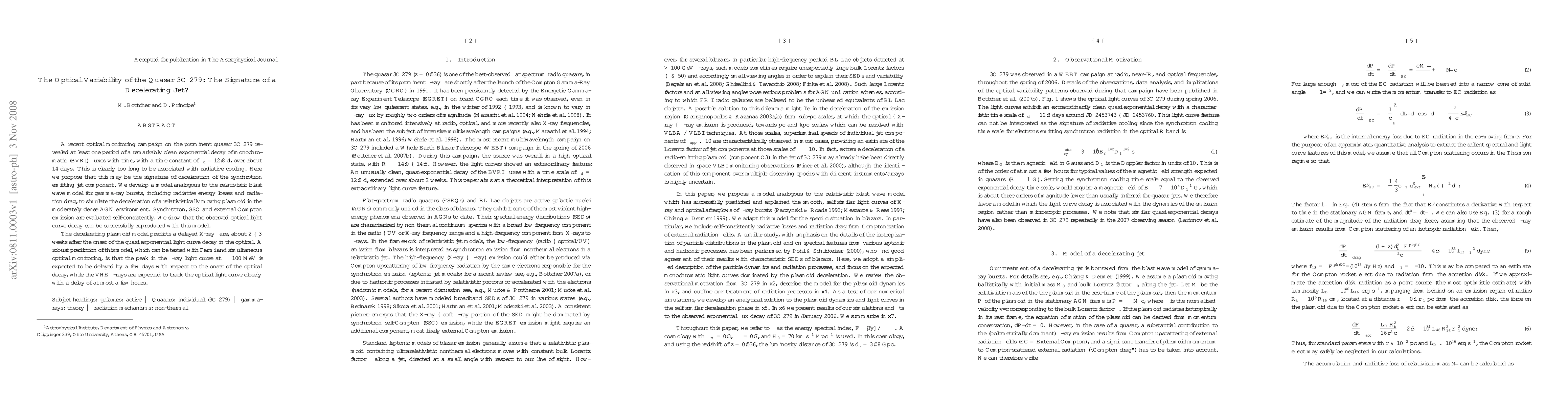 A recent optical monitoring campaign on the prominent quasar 3C279 revealed a period of a remarkably clean exponential decay of BVRI fluxes with time, with a time constant of 12.8 d, over about 14 days. This is clearly too long to be associated with radiative cooling. Here we propose that this may be the signature of deceleration of the synchrotron emitting jet component. We develop a model analogous to the relativistic blast wave model for GRBs, including radiative energy losses and radiation drag, to simulate the deceleration of a relativistically moving plasmoid in the moderately dense AGN environment. Synchrotron, SSC and external Compton emission are evaluated self-consistently. We show that the observed optical light curve decay can be successfully reproduced with this model. The decelerating plasmoid model predicts a delayed X-ray flare, about 2 - 3 weeks after the onset of the quasi-exponential light curve decay in the optical. A robust prediction of this model, which can be tested with Fermi and simultaneous optical monitoring, is that the peak in the gamma-ray light curve at ~ 100 MeV is expected to be delayed by a few days with respect to the onset of the optical decay, while the VHE gamma-rays are expected to track the optical light curve closely with a delay of at most a few hours.