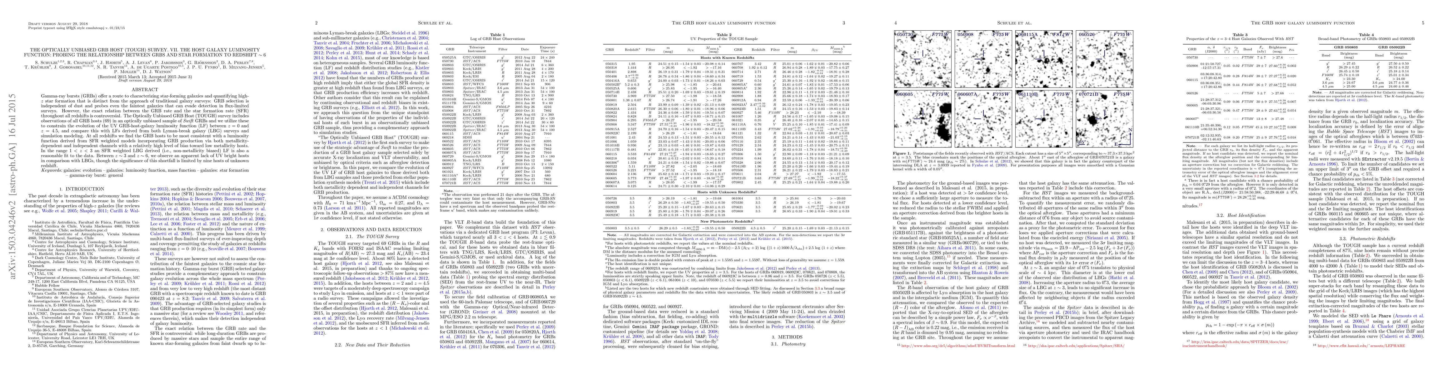 The TOUGH survey investigates the luminosity function of gamma-ray burst (GRB) host galaxies, revealing a strong correlation between GRBs and star formation rates (SFR) across redshifts. The study finds GRB hosts align with SFR-weighted luminosity functions, indicating a preference for low metallicity environments.