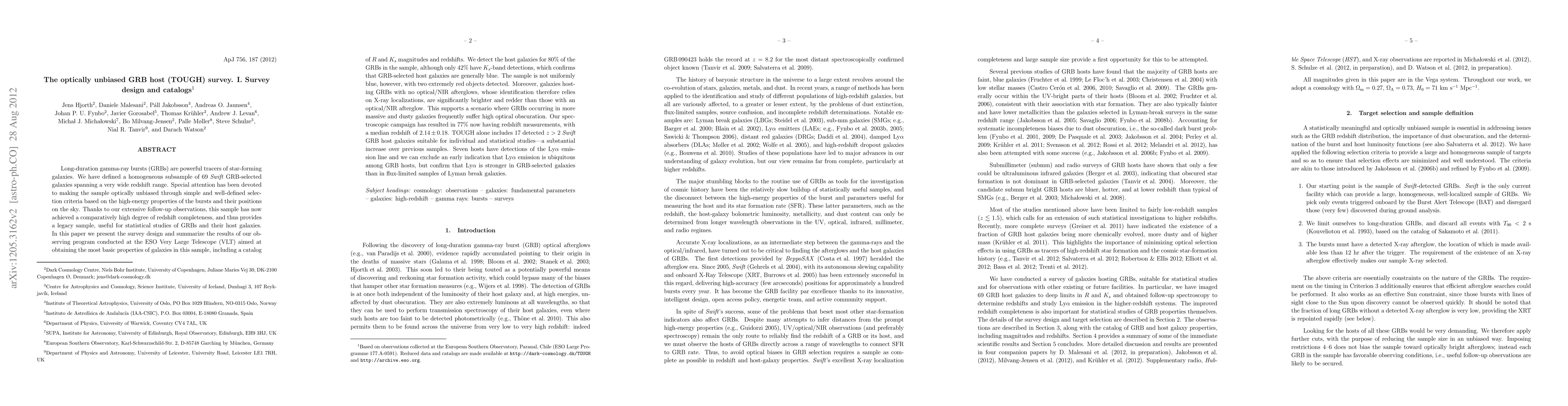 Long-duration gamma-ray bursts (GRBs) are powerful tracers of star-forming galaxies. We have defined a homogeneous subsample of 69 Swift GRB-selected galaxies spanning a very wide redshift range. Special attention has been devoted to making the sample optically unbiased through simple and well-defined selection criteria based on the high-energy properties of the bursts and their positions on the sky. Thanks to our extensive follow-up observations, this sample has now achieved a comparatively high degree of redshift completeness, and thus provides a legacy sample, useful for statistical studies of GRBs and their host galaxies. In this paper we present the survey design and summarize the results of our observing program conducted at the ESO Very Large Telescope (VLT) aimed at obtaining the most basic properties of galaxies in this sample, including a catalog of R and Ks magnitudes and redshifts. We detect the host galaxies for 80 % of the GRBs in the sample, although only 42 % have Ks-band detections, which confirms that GRB-selected host galaxies are generally blue. The sample is not uniformly blue, however, with two extremely red objects detected. Moreover, galaxies hosting GRBs with no optical/NIR afterglows, whose identification therefore relies on X-ray localizations, are significantly brighter and redder than those with an optical/NIR afterglow. Our spectroscopic campaign has resulted in 77 % now having redshift measurements, with a median redshift of 2.14 +- 0.18. TOUGH alone includes 17 detected z > 2 Swift GRB host galaxies suitable for individual and statistical studies. Seven hosts have detections of the Ly-alpha emission line and we can exclude an early indication that Ly-alpha emission is ubiquitous among GRB hosts, but confirm that Ly-alpha is stronger in GRB-selected galaxies than in flux-limited samples of Lyman break galaxies.