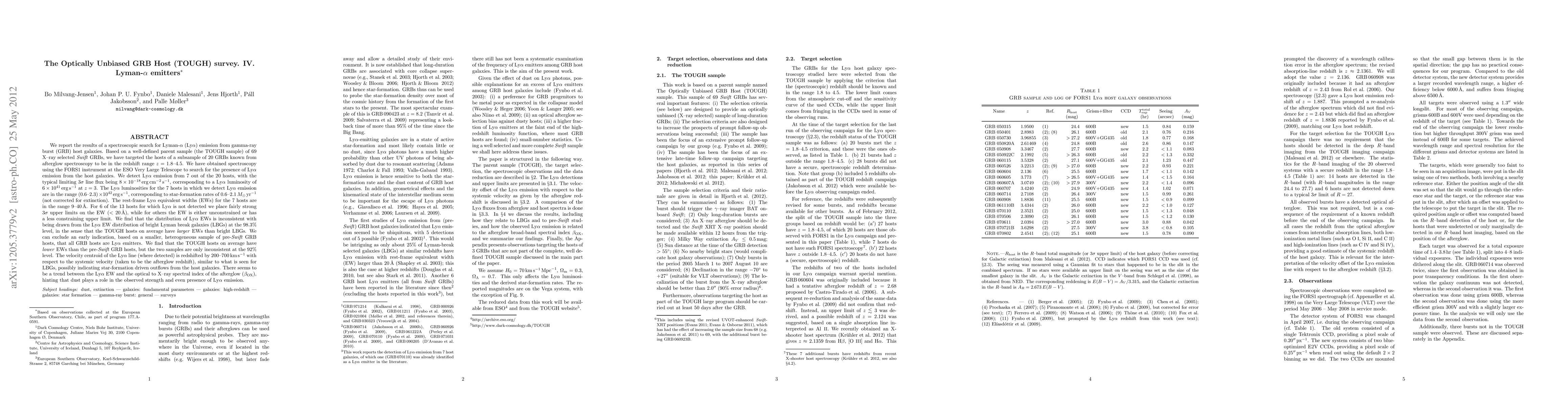 The TOUGH survey targeted 20 GRB host galaxies and detected Lyman-alpha emission in 7, finding larger EWs than typical Lyman break galaxies. The study also reveals a possible trend between Lyman-alpha EW and afterglow optical-to-X-ray spectral index, suggesting dust impacts Lyman-alpha emission.