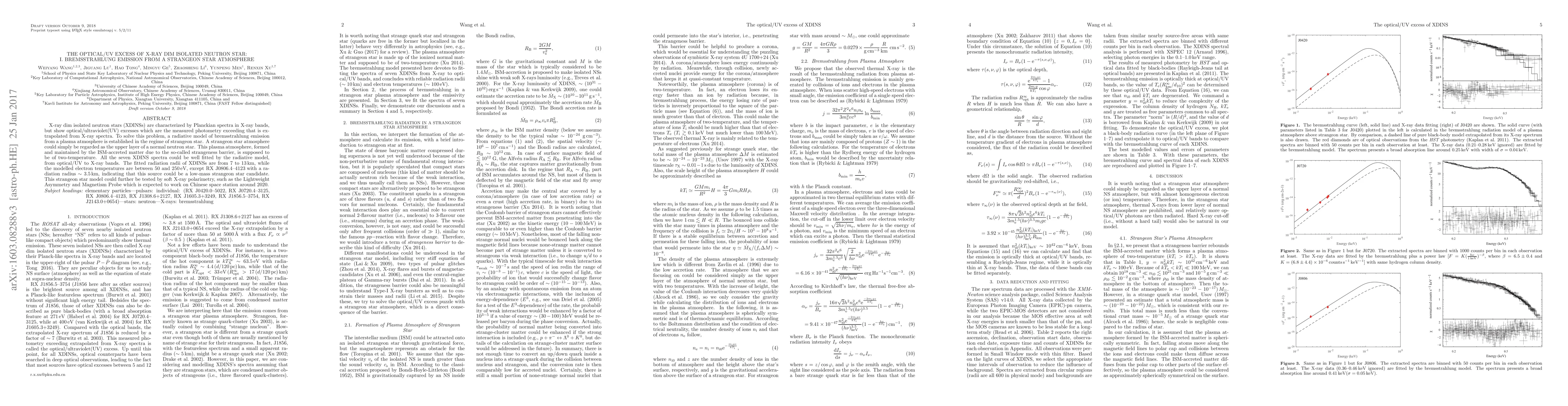 This paper proposes a radiative model of bremsstrahlung emission from a plasma atmosphere in strangeon stars to explain the optical/UV excess in X-ray dim isolated neutron stars (XDINSs). The model fits the spectra of seven XDINSs, suggesting the atmospheres are of two-temperature and formed by ISM-accreted matter, with potential low-mass candidates identified.