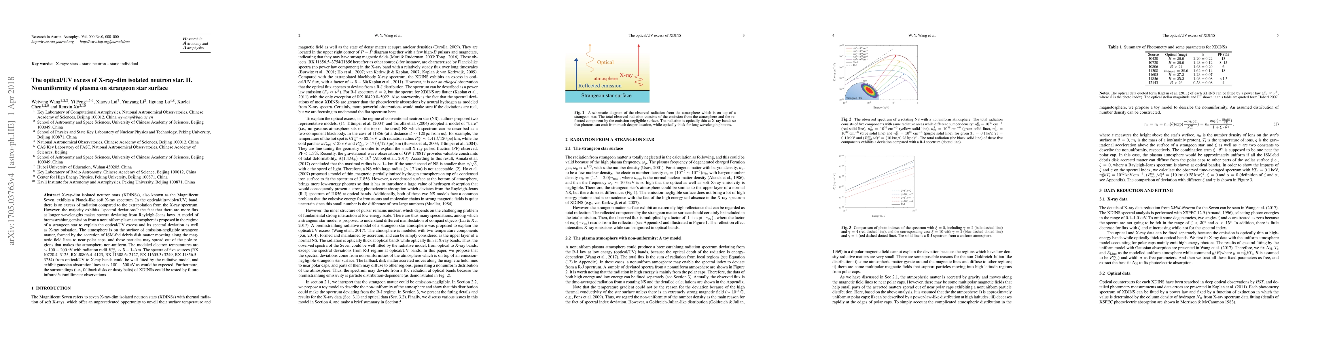 X-ray-dim isolated neutron stars (XDINSs), also known as the Magnificent Seven, exhibits a Planck-like soft X-ray spectrum. In the optical/ultraviolet(UV) band, there is an excess of radiation compared to the extrapolation from the X-ray spectrum. A model of bremsstrahlung emission from a nonuniform plasma atmosphere is proposed in the regime of a strangeon star to explain the optical/UV excess and its spectral deviation. The nonuniform atmosphere is formed by the accretion of interstellar matter which moves along the magnetic field lines to polar caps, and these particles may spread out of the pole regions. The modeled electron temperatures are $\sim100-200$ eV with radiation radii $R_{\rm opt}^{\infty}\sim5-14$ km. The spectra of five sources (RX J0720.4--3125, RX J0806.4--4123, RX J1308.6+2127, RX J1605.3+3249, RX J1856.5--3754) from optical/UV to X-ray bands could be well fitted by the radiative model, and exhibit gaussian absorption lines at $\sim 100-500$ eV as would be expected. Furthermore, the surroundings (i.e., fallback disks or dusty belts) of XDINSs could be tested by future observations with the Large Optical Telescope (LOT).