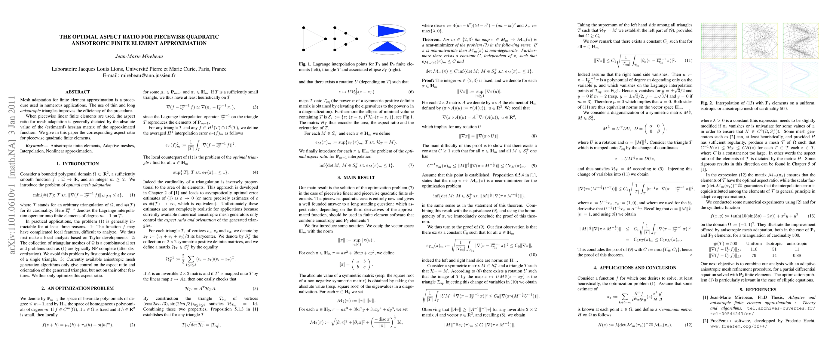 Mesh adaptation for finite element approximation is a procedure used in numerous applications. The use of thin and long anisotropic triangles improves the efficiency of the procedure. When piecewise linear finite elements are used, the aspect ratio for mesh adaptation is generally dictated by the absolute value of the (estimated) hessian matrix of the approximated function. We give in this paper the corresponding aspect ratio for piecewise quadratic finite elements.