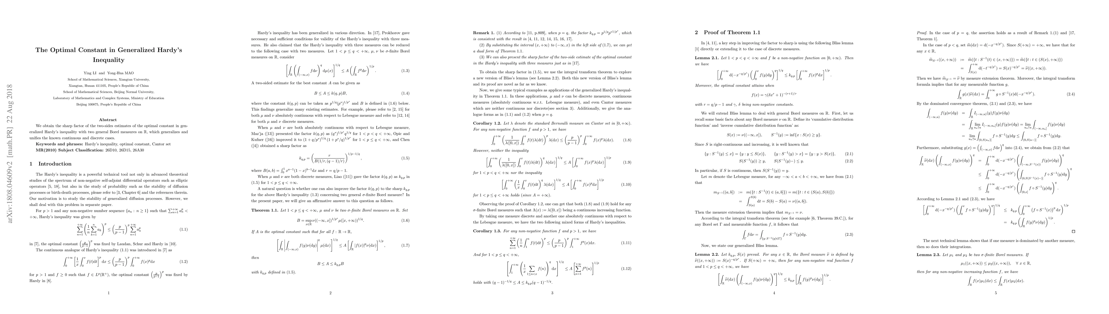 We obtain the sharp factor of the two-sides estimates of the optimal constant in generalized Hardy's inequality with two general Borel measures on $\mathbb{R}$, which generalizes and unifies the known continuous and discrete cases.