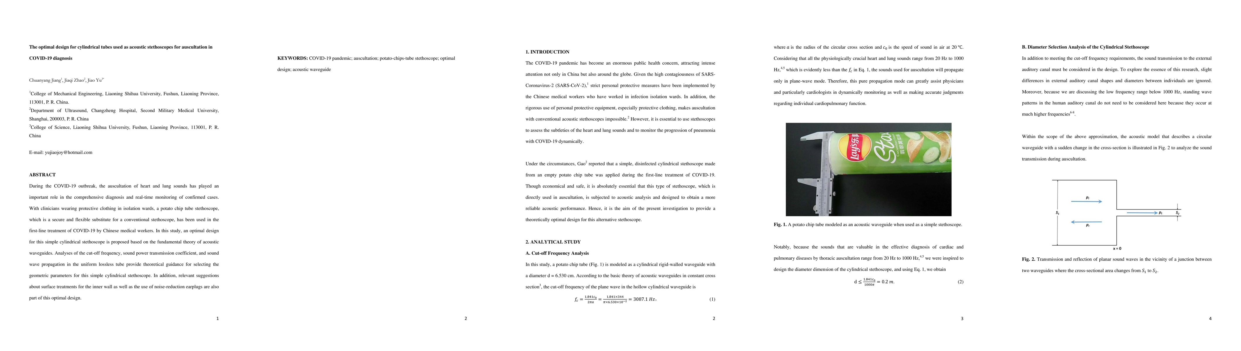 During the COVID-19 outbreak, the auscultation of heart and lung sounds has played an important role in the comprehensive diagnosis and real-time monitoring of confirmed cases. With clinicians wearing protective clothing in isolation wards, a potato chip tube stethoscope, which is a secure and flexible substitute for a conventional stethoscope, has been used in the first-line treatment of COVID-19 by Chinese medical workers. In this study, an optimal design for this simple cylindrical stethoscope is proposed based on the fundamental theory of acoustic waveguides. Analyses of the cut-off frequency, sound power transmission coefficient, and sound wave propagation in the uniform lossless tube provide theoretical guidance for selecting the geometric parameters for this simple cylindrical stethoscope. In addition, relevant suggestions about surface treatments for the inner wall as well as the use of noise-reduction earplugs are also part of this optimal design.