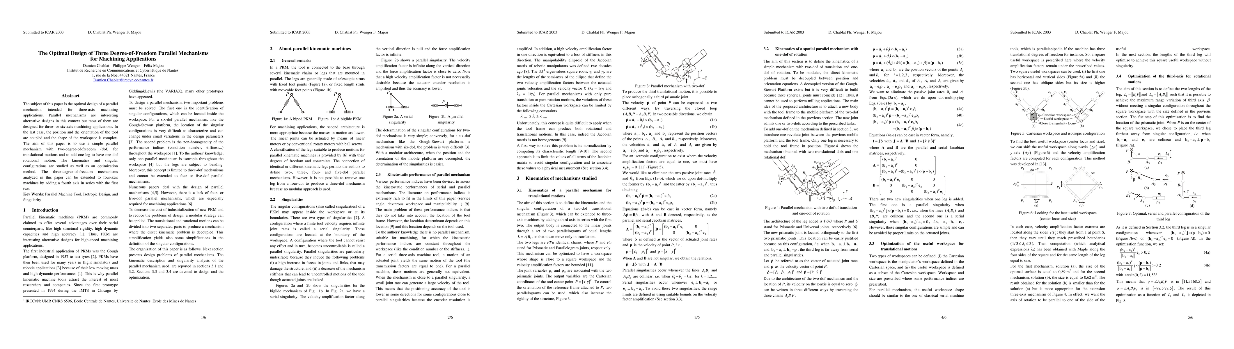 The subject of this paper is the optimal design of a parallel mechanism intended for three-axis machining applications. Parallel mechanisms are interesting alternative designs in this context but most of them are designed for three- or six-axis machining applications. In the last case, the position and the orientation of the tool are coupled and the shape of the workspace is complex. The aim of this paper is to use a simple parallel mechanism with two-degree-of-freedom (dof) for translational motions and to add one leg to have one-dof rotational motion. The kinematics and singular configurations are studied as well as an optimization method. The three-degree-of-freedom mechanisms analyzed in this paper can be extended to four-axis machines by adding a fourth axis in series with the first two.