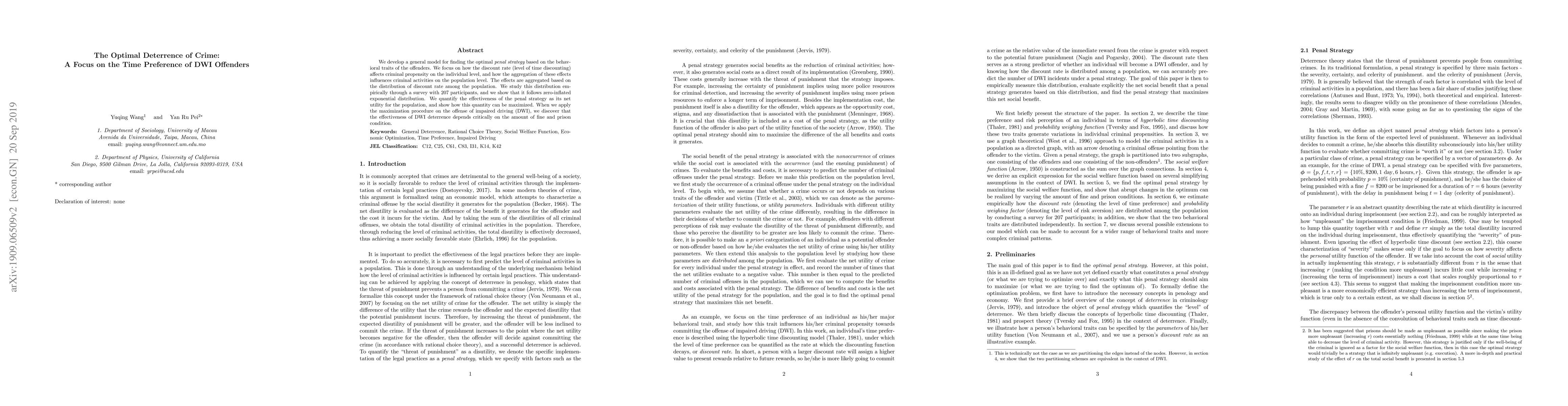 This paper develops a model to determine the optimal penal strategy for deterring crime, focusing on the time preference of DWI offenders. It finds that the effectiveness of deterrence for impaired driving depends significantly on the fine amount and prison conditions, based on a survey showing a zero-inflated exponential distribution of discount rates among offenders.