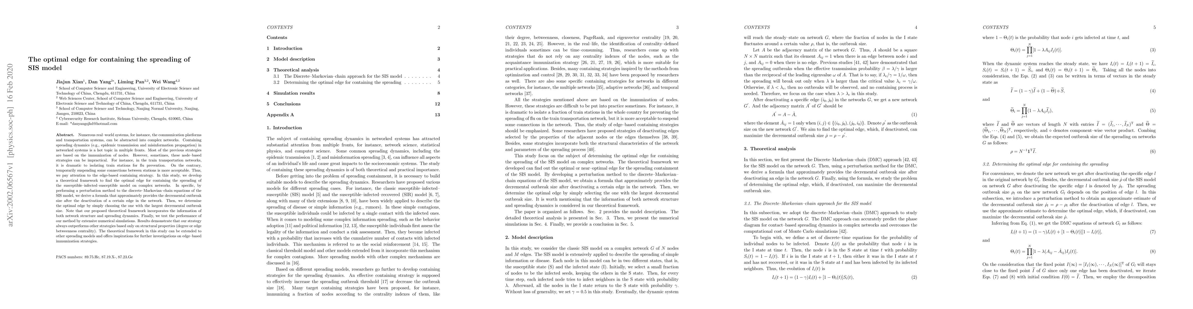 This paper develops a theoretical framework to identify the optimal edge for containing the spread of the SIS model in complex networks, focusing on edge-based strategies rather than node-based immunization. The proposed method outperforms traditional strategies by considering both network structure and spreading dynamics, as demonstrated through extensive numerical simulations.