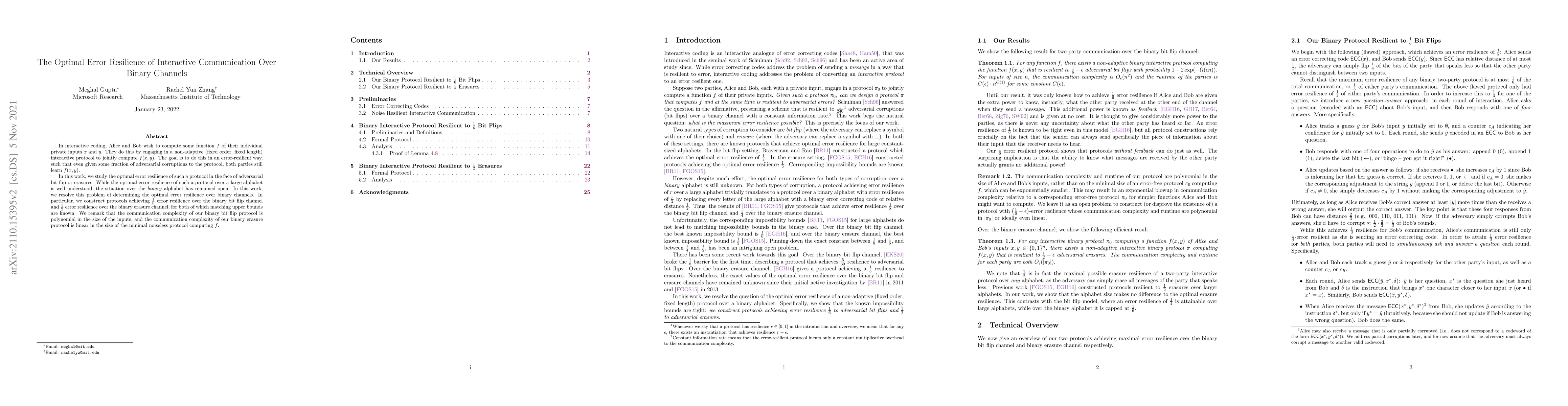 In interactive coding, Alice and Bob wish to compute some function $f$ of their individual private inputs $x$ and $y$. They do this by engaging in a non-adaptive (fixed order, fixed length) protocol to jointly compute $f(x,y)$. The goal is to do this in an error-resilient way, such that even given some fraction of adversarial corruptions to the protocol, both parties still learn $f(x,y)$. In this work, we study the optimal error resilience of such a protocol in the face of adversarial bit flip or erasures. While the optimal error resilience of such a protocol over a large alphabet is well understood, the situation over the binary alphabet has remained open. In this work, we resolve this problem of determining the optimal error resilience over binary channels. In particular, we construct protocols achieving $\frac16$ error resilience over the binary bit flip channel and $\frac12$ error resilience over the binary erasure channel, for both of which matching upper bounds are known. We remark that the communication complexity of our binary bit flip protocol is polynomial in the size of the inputs, and the communication complexity of our binary erasure protocol is linear in the size of the minimal noiseless protocol computing $f$.