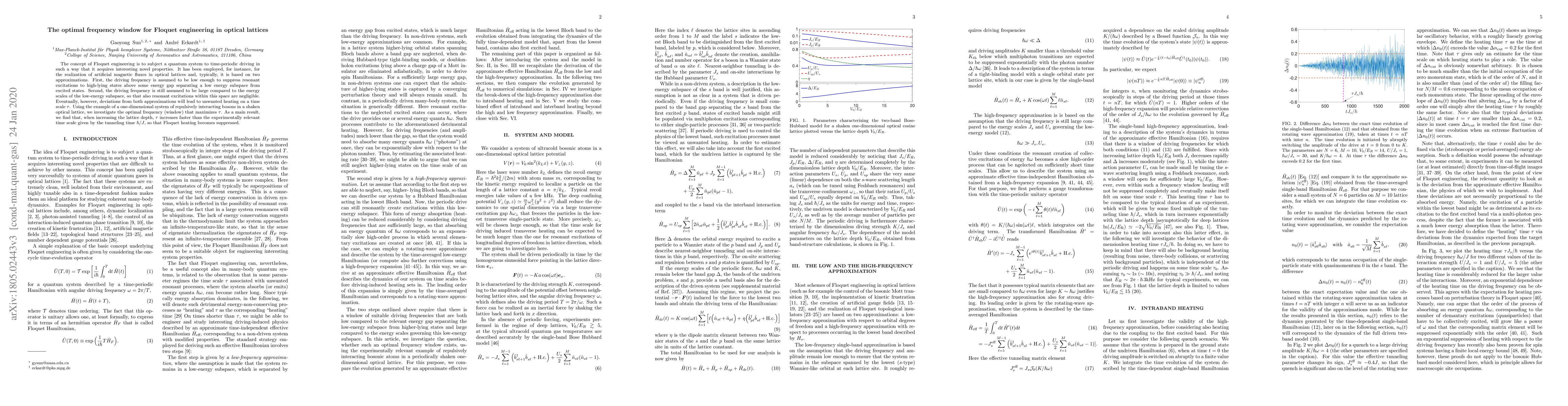 This paper investigates the optimal frequency window for Floquet engineering in optical lattices, focusing on maximizing the time scale $\tau$ to suppress unwanted heating. The study finds that increasing the lattice depth enhances $\tau$ more than the tunneling time $\hbar/J$, effectively reducing Floquet heating.