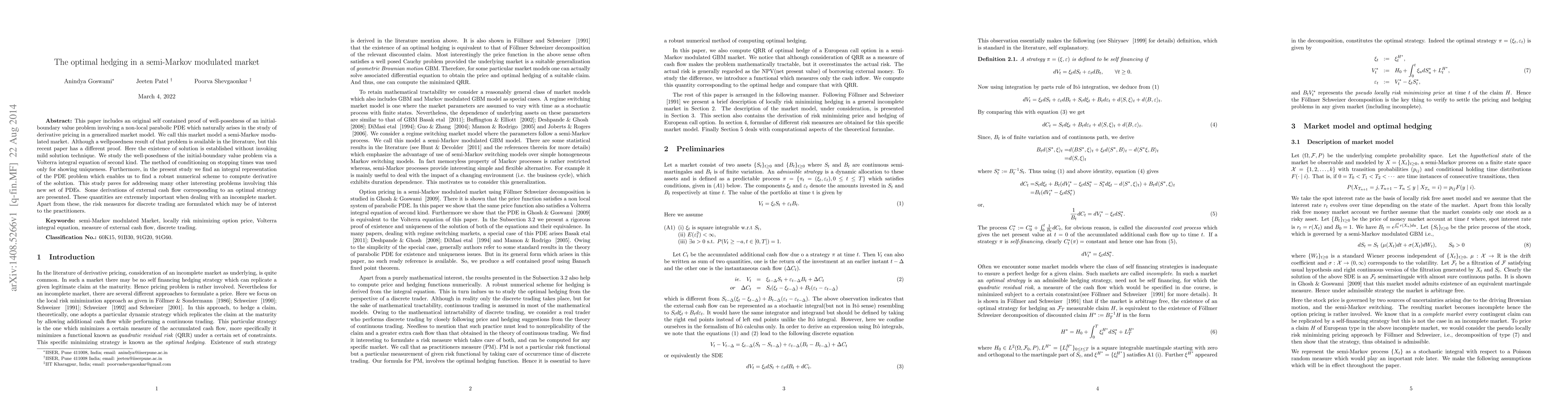 This paper includes an original self contained proof of well-posedness of an initial-boundary value problem involving a non-local parabolic PDE which naturally arises in the study of derivative pricing in a generalized market model. We call this market model a semi-Markov modulated market. Although a wellposedness result of that problem is available in the literature, but this recent paper has a different proof. Here the existence of solution is established without invoking mild solution technique. We study the well-posedness of the initial-boundary value problem via a Volterra integral equation of second kind. The method of conditioning on stopping times was used only for showing uniqueness. Furthermore, in the present study we find an integral representation of the PDE problem which enables us to find a robust numerical scheme to compute derivative of the solution. This study paves for addressing many other interesting problems involving this new set of PDEs. Some derivations of external cash flow corresponding to an optimal strategy are presented. These quantities are extremely important when dealing with an incomplete market. Apart from these, the risk measures for discrete trading are formulated which may be of interest to the practitioners.